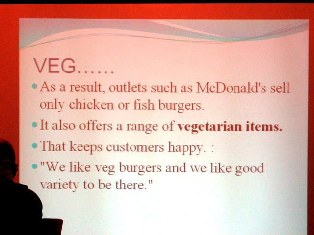 Anche la catena McDonald's si e' adeguata ai gusti locali e alla consolidata abitudine vegetariana dei consumatori indiani, proponendo hamburger a base di verdure, pesce o pollame.