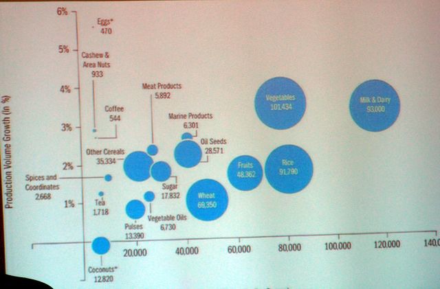 Mr. Barde ha presentato una serie di slides. Questa evidenzia i diversi comparti merceologici indiani, a seconda della loro crescita percentuale in termini di volumi e di valori. Latte e derivati, verdure, riso e frutta costituiscono i settori piu' importanti dell'industria agroalimentare indiana.