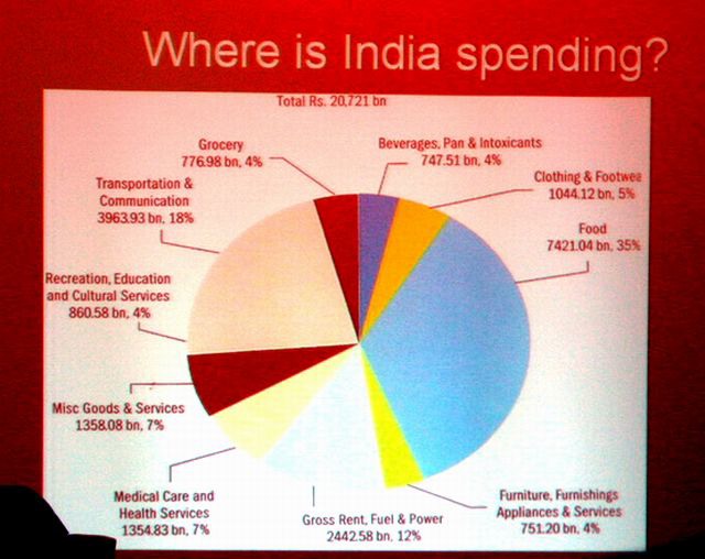 La torta indica le principali voci di spesa nell'ambito del consumo indiano. L'alimentare fa la parte del leone, assorbendo ben il 35% della spesa.
