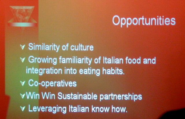 Tra i fattori che avvantaggiano la partnership tra Italia e India, Mr. Sameer Barde ha indicato gli aspetti di somiglianza tra le due culture, la crescente familiarita' del consumatore indiano con il cibo italiano, la presenza dell'organizzazione cooperativa. Tutto cio' delinea uno scenario di collaborazione nel quale entrambe le parti possono trarre beneficio.