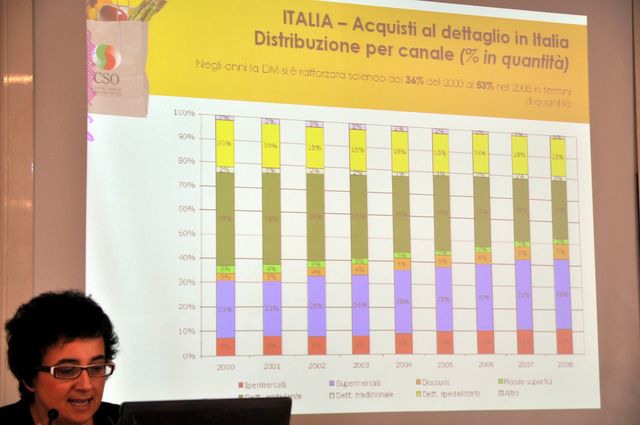 Questo grafico evidenzia il crescente peso della grande distribuzione organizzata (supermercati, ipermercati e discount) negli acquisti al dettaglio di ortofrutta in Italia.