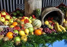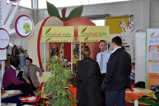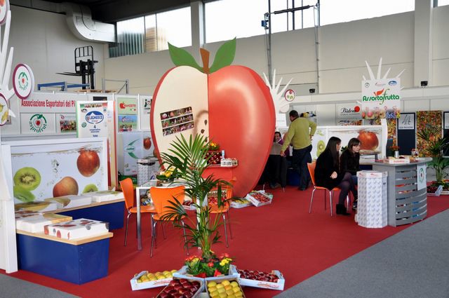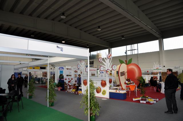 Una serie di stand sono stati allestiti in uno dei magazzini della Asprofrut.