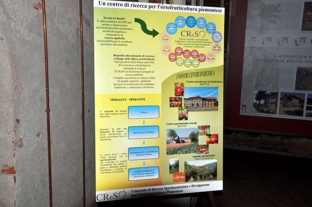 Un tabellone illustra l'articolazione del centro di ricerca per l'ortofrutta piemontese CReSO.