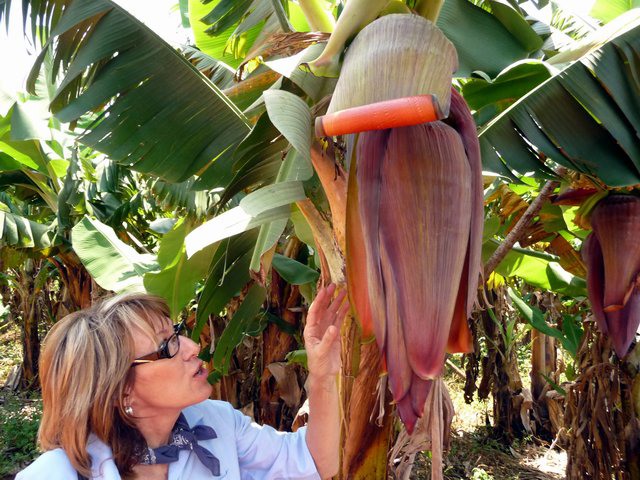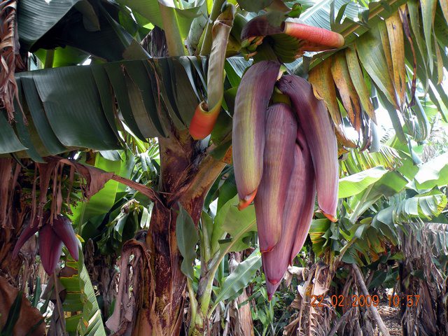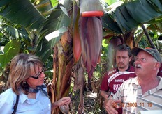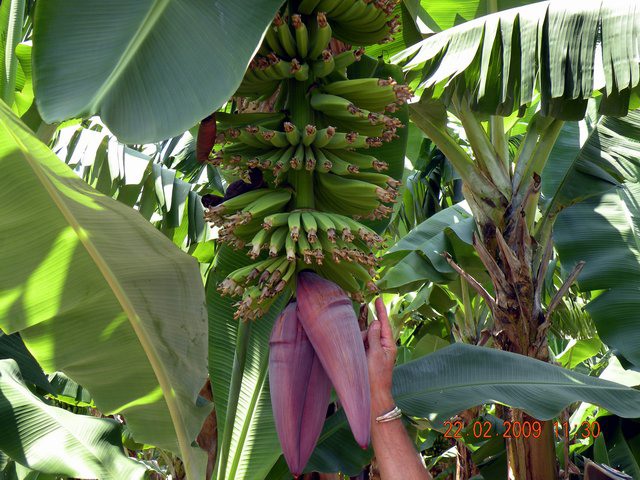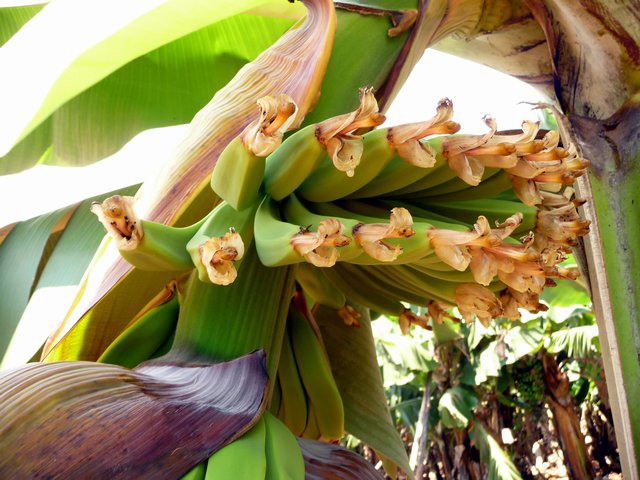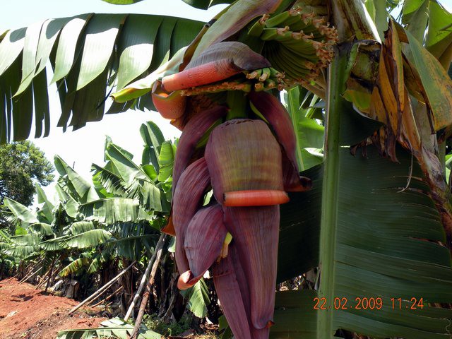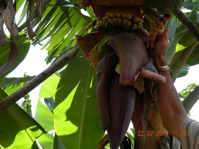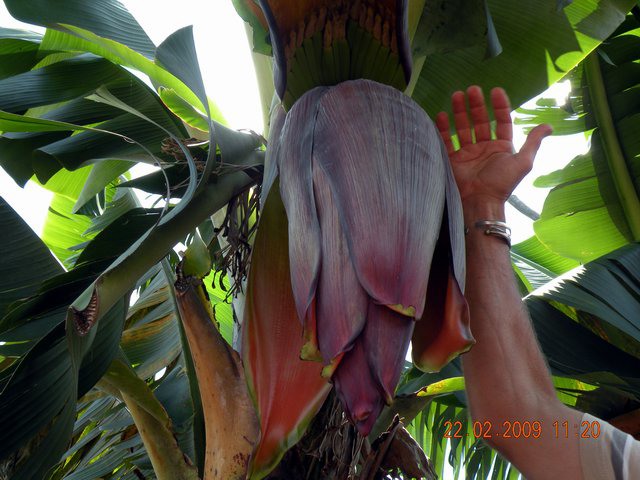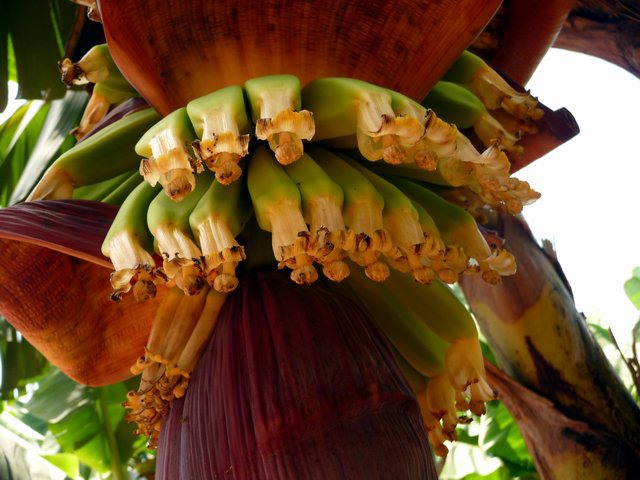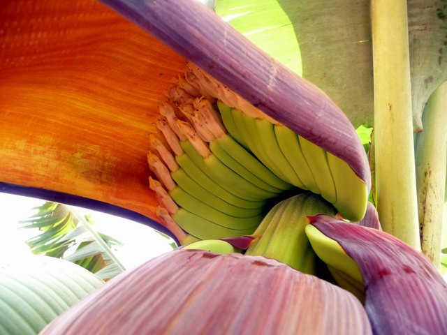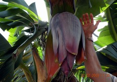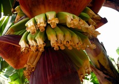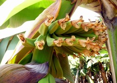Quando il fiore viene fecondato, la foglia che lo ricopre e che lo protegge dal sole e dalla pioggia si arrotola verso l'alto, scoprendo le banane in formazione.