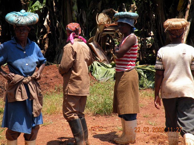 Le donne, munite di copricapo imbottiti, sono pronte a sostenere sul capo il peso dei caschi di banane, che possono arrivare a oltre 40 kg ciascuno.