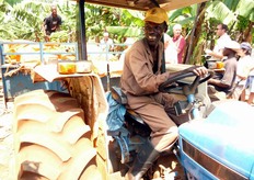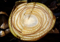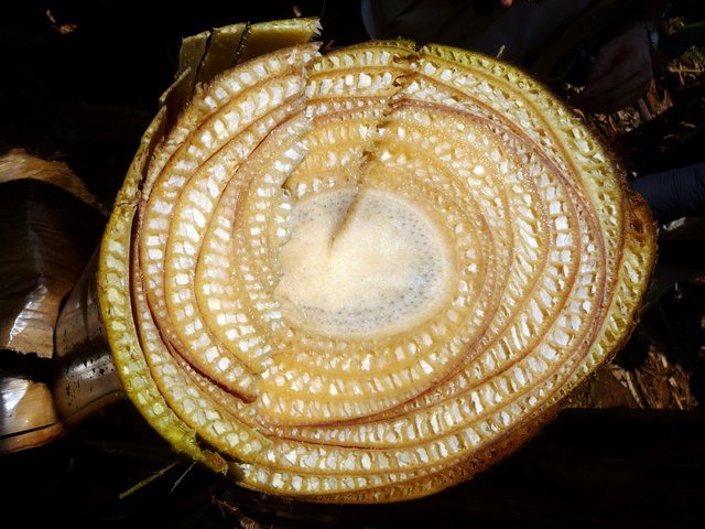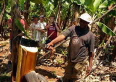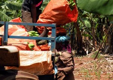 Per procedere alla raccolta del casco, si incide il fusto della pianta con un machete. Il peso dei frutti tende a far piegare verso il basso la pianta.