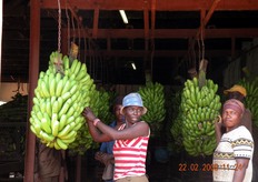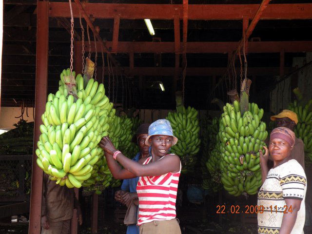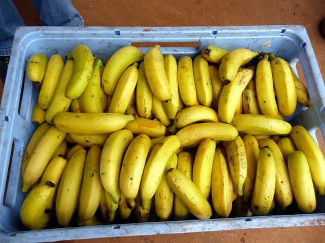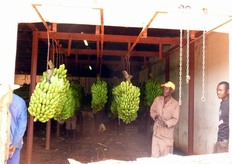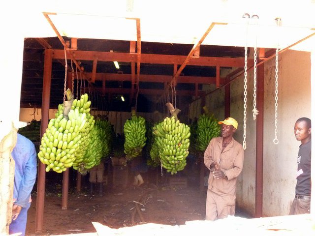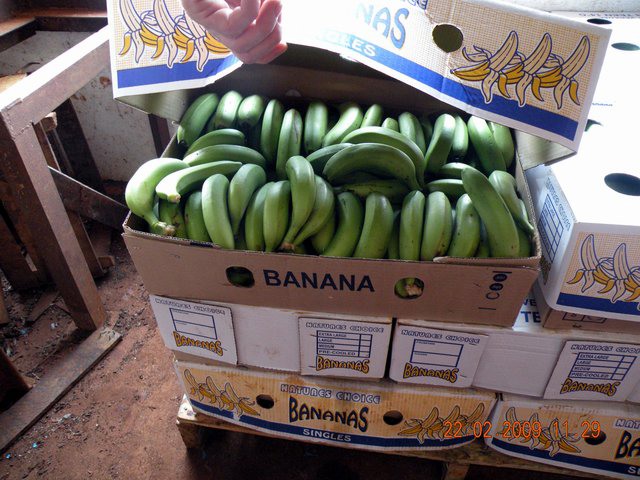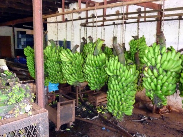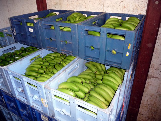 Le banane vengono divise a mano in gruppi di 5-6 frutti, messe in casse e deposte per circa 15 giorni in celle di maturazione, dove passeranno dalla colorazione verde a quella gialla.