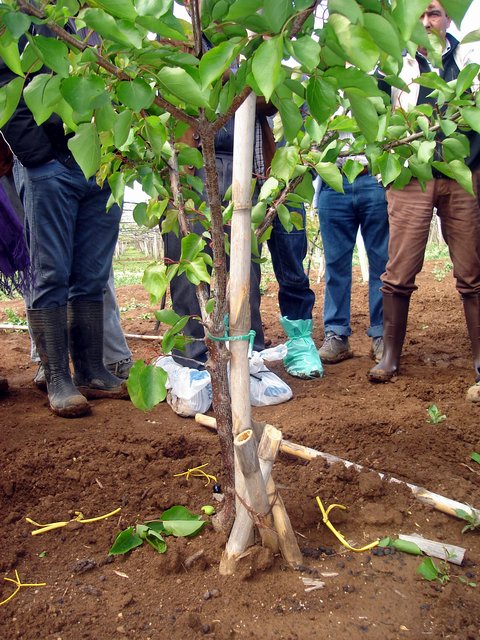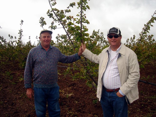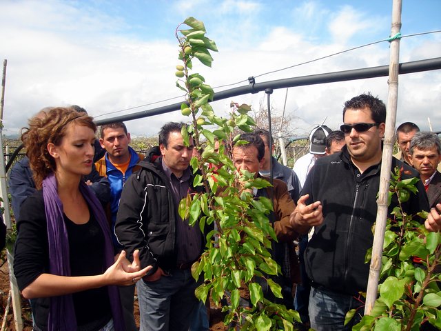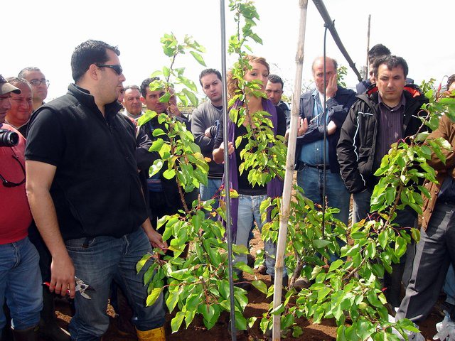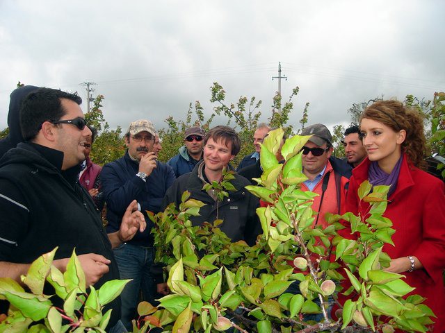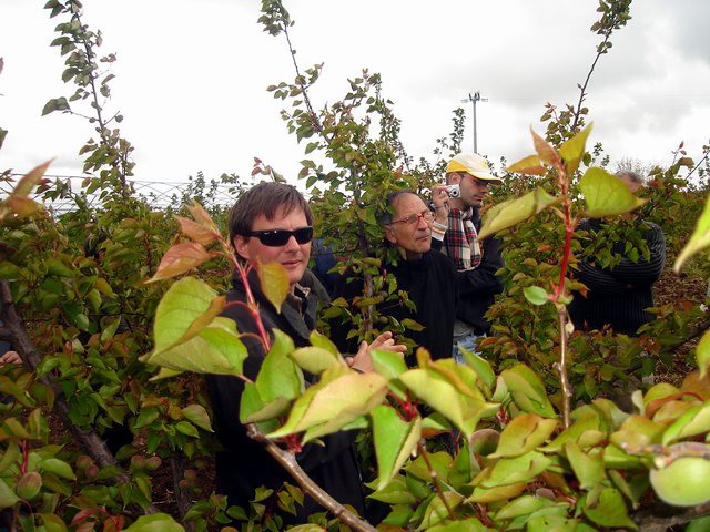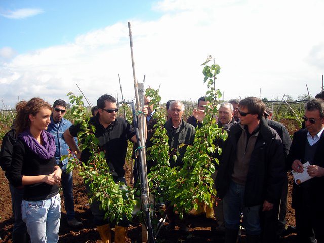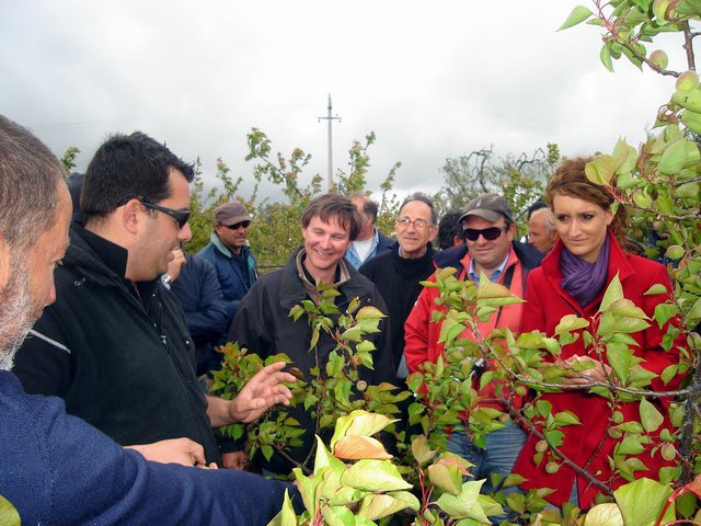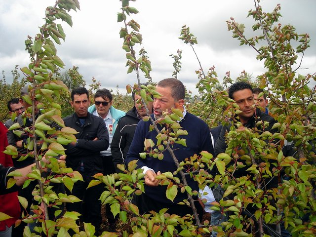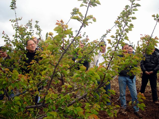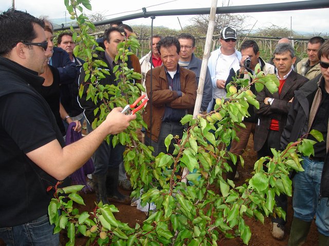 L’agrotecnico Donato Carone di Scanzano Jonico (in foto al centro) si confronta con il collega del gruppo Escande sulle tecniche di gestione della pianta della cultivar “Kioto”. Carone ritiene che “Kioto”, se ben gestita tecnicamente, sia tra le varieta' di albicocco autofertili a maturazione medio precoce candidate ad avere un’ottima diffusione in futuro nel metapontino.