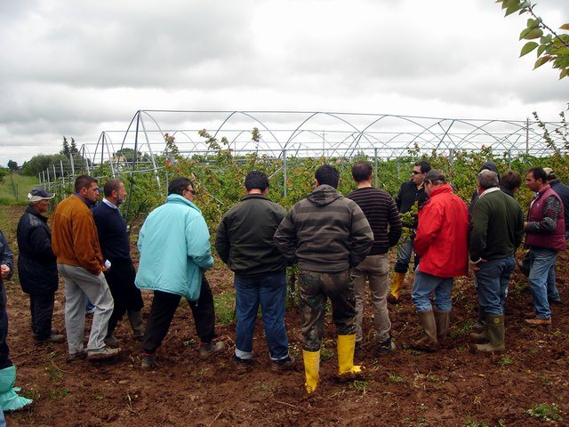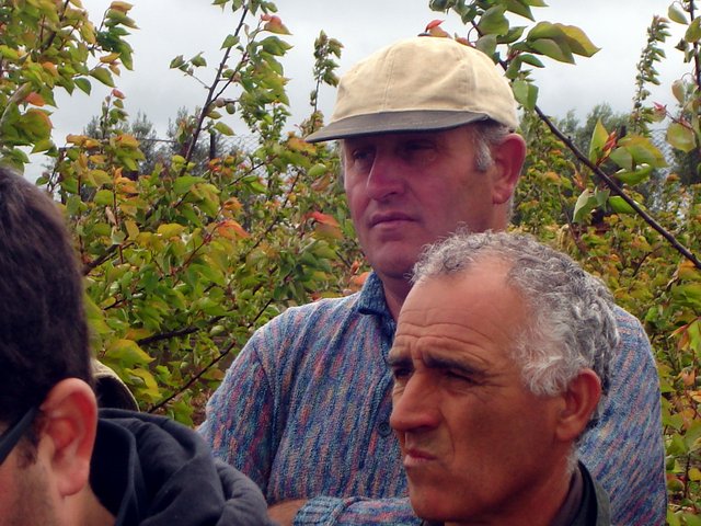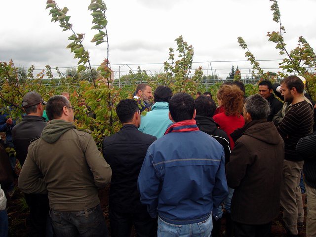 Il Sig. Ruggero Fortunato (con il berretto) e' tra i primi frutticoltori del metapontino ad aver realizzato (2008) impianti di albicocco con varieta' del gruppo Escande-BEE.