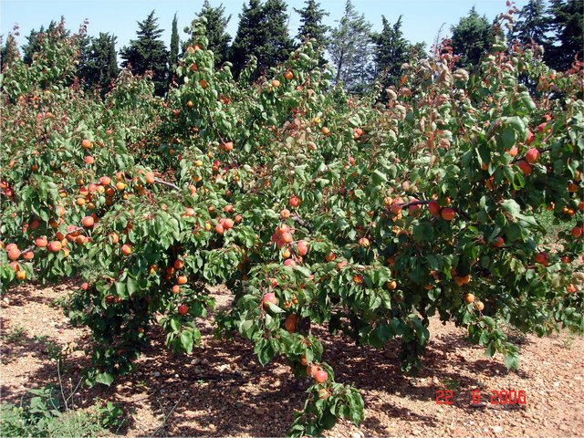 Piante di Pinkcot(R) con frutti prossimi alla raccolta in un frutteto a Perpignan (Francia)