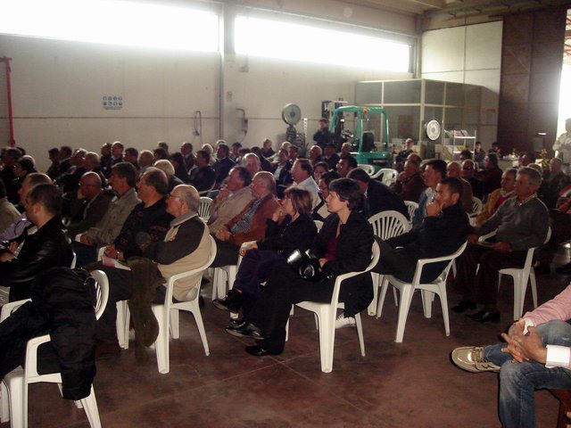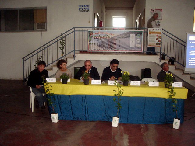 Momento dei saluti di Vito Agresti, sindaco di Rotondella, all’apertura dei lavori del 20 aprile 2009, presso la sede della Coop. ORTOFRUTTICOLA TRISAIA. Da destra verso sinistra: Benoit Escande, Edwige Remy, Vito Agresti, Carmelo Mennone, Giuseppe Acinapura.