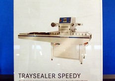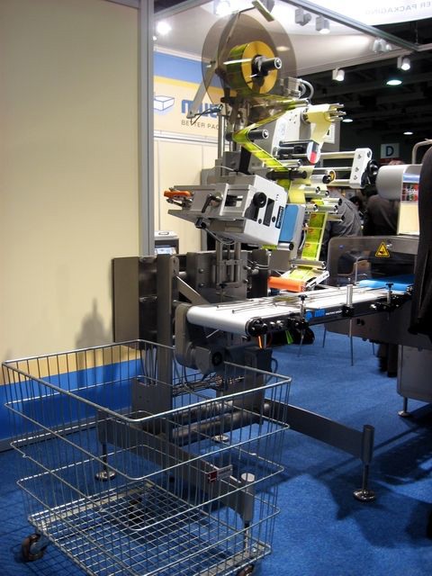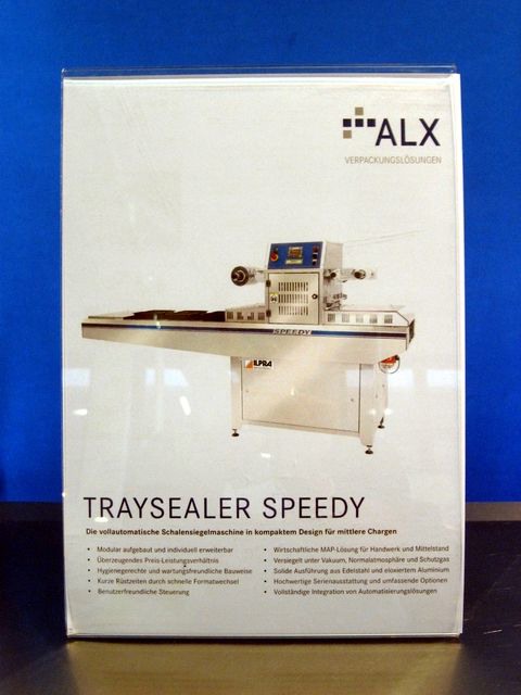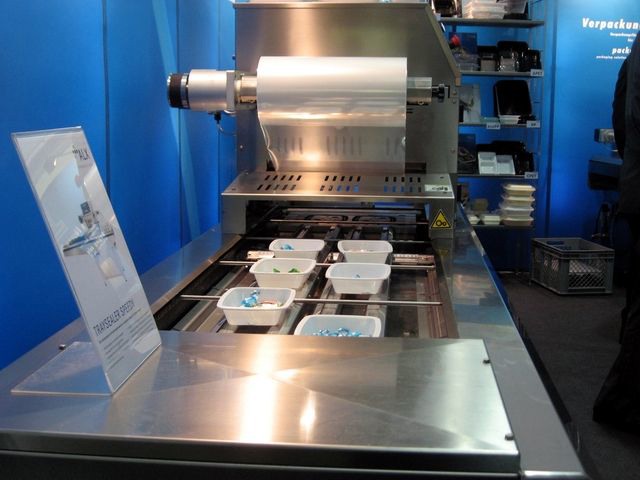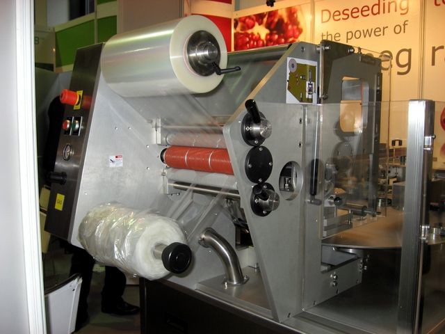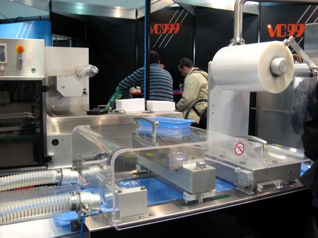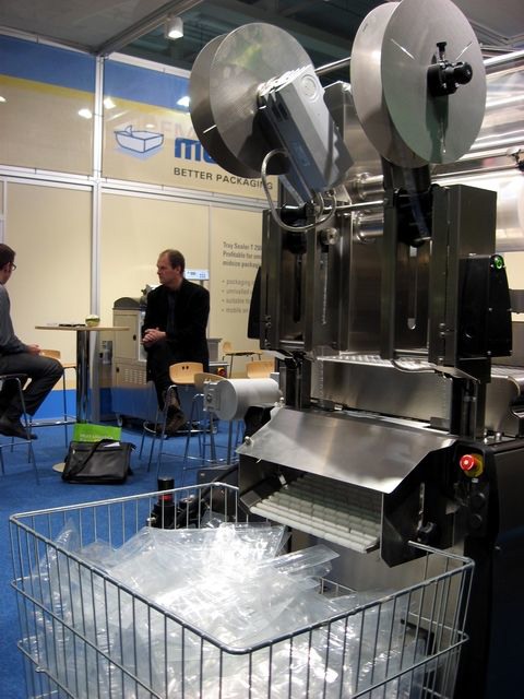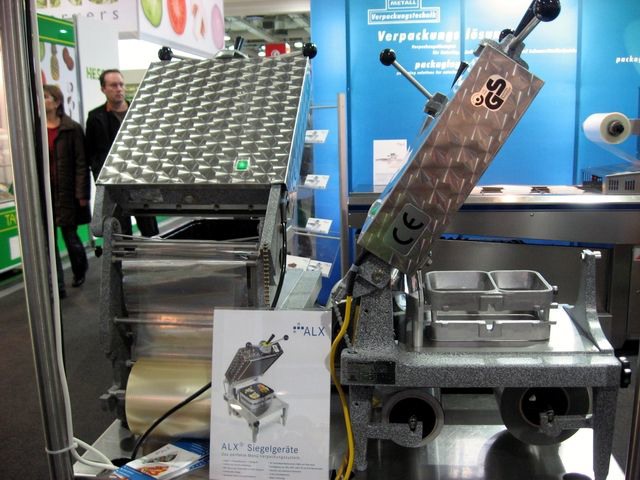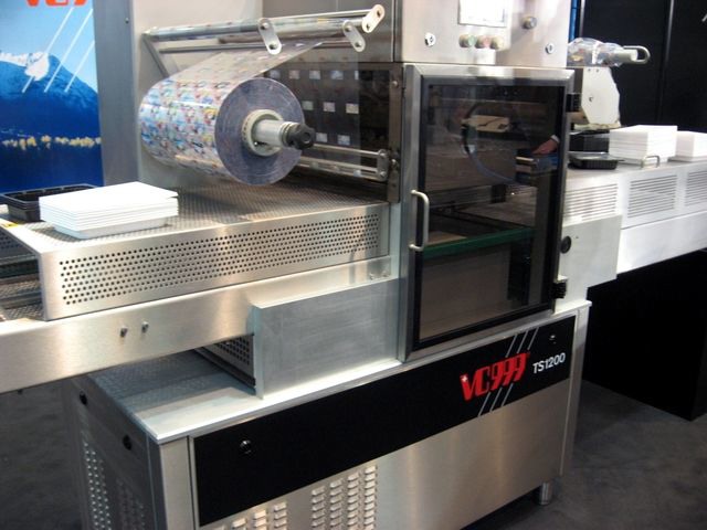 Macchina confezionatrice di vassoi della ALX. Il film non viene semplicemente tagliato dal rotolo, ma e' tagliato lungo i contorni del vassoio.