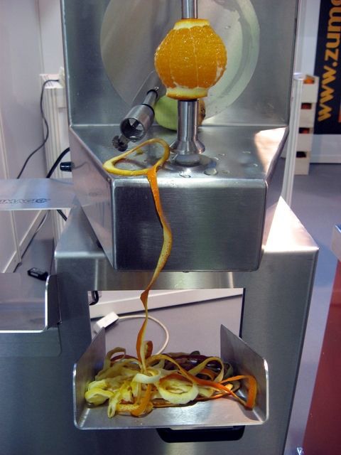 Nel dettaglio vediamo la pelatura di un'arancia. I frutti vengono fatti ruotare sul loro asse tramite un tridente inferiore e vengono fissati tramite un puntale mobile nella parte superiore. Possono essere sbucciati frutti fino a un'altezza massima di 120mm. Un braccio mobile segue la superficie del frutto e si ferma automaticamente a fine ciclo.