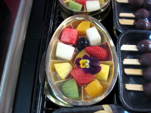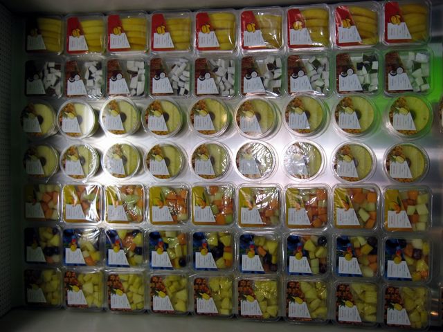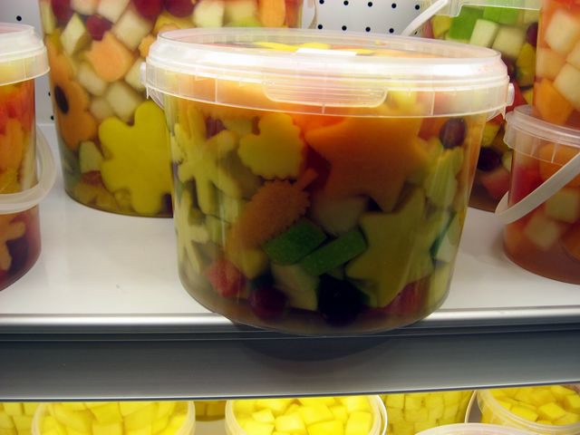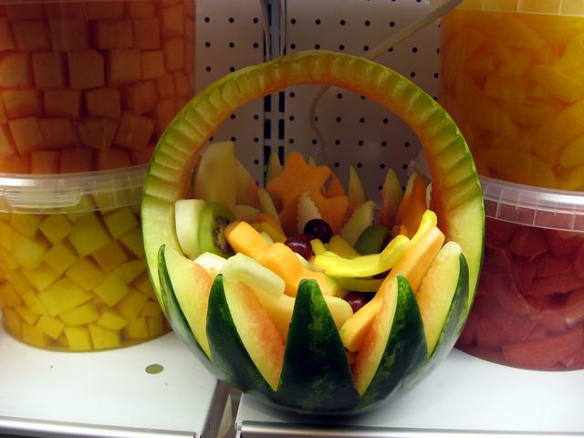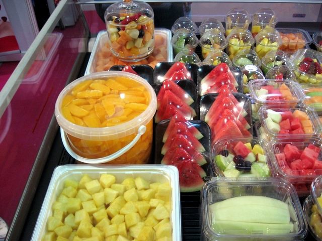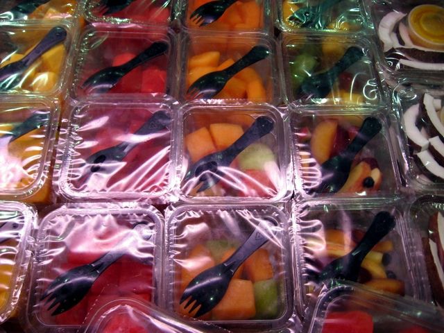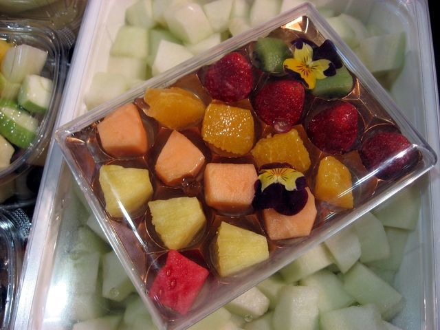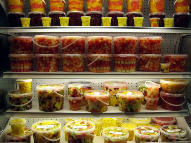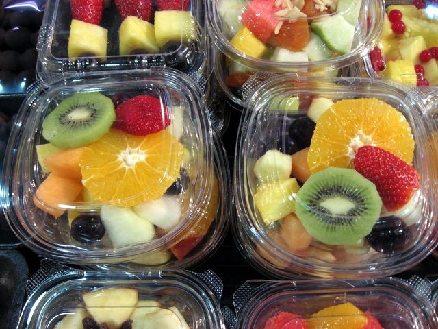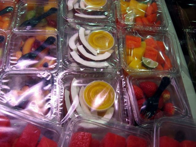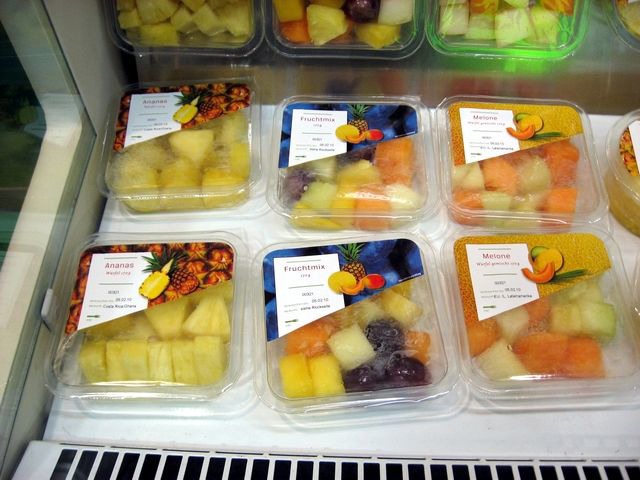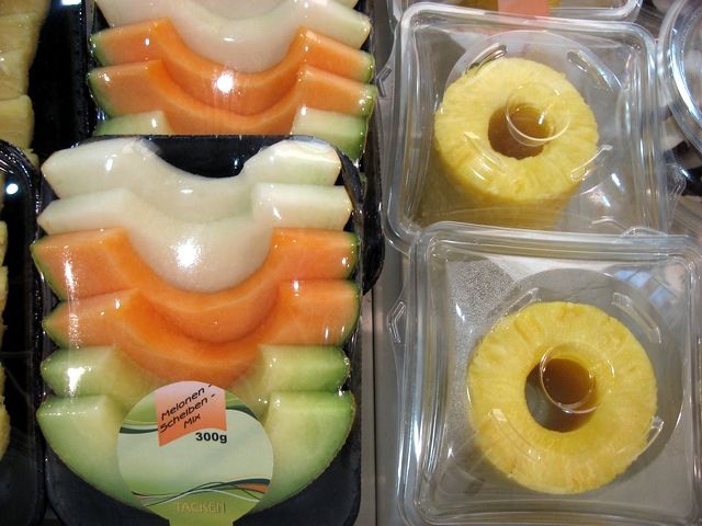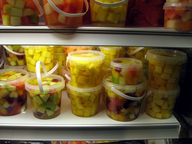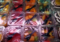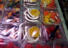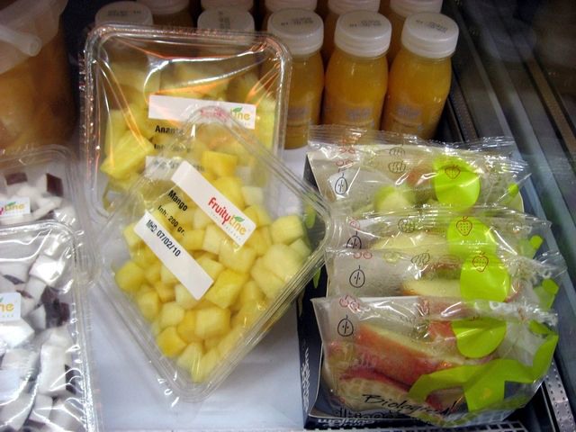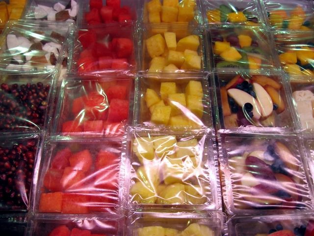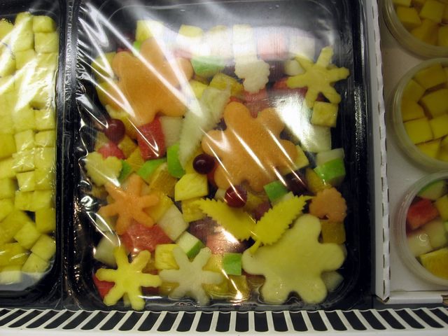 Dettaglio di confezione di frutta tagliata in varie forme.