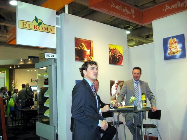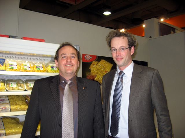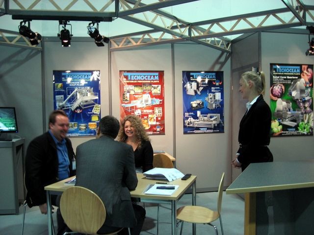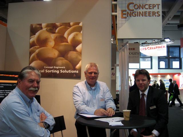 Stand Concept Engineers (Olanda). L'azienda e' specializzata in macchinari di selezione ottica per l'industria agroalimentare. Al centro Frank Tukker (Sales Manager della Concept Engineers) a colloquio con Arjan Brouwer (Sales Manager dell'azienda partner Kiremko).