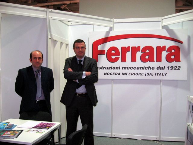 Stand Ferrara Costruzioni Meccaniche Srl (Italia). Negli anni piu' recenti l'azienda si e' dedicata, in particolare modo, alla progettazione e costruzione di macchine e linee complete per la lavorazione dei carciofi, settore in cui può vantare una notevole efficienza e specializzazione, che l’ha portata ad acquisire una posizione di leadership sul mercato nazionale ed una grossa fetta del mercato mondiale. Nella foto il Managing Director Gianluca Ferrara (a destra) con un collaboratore.