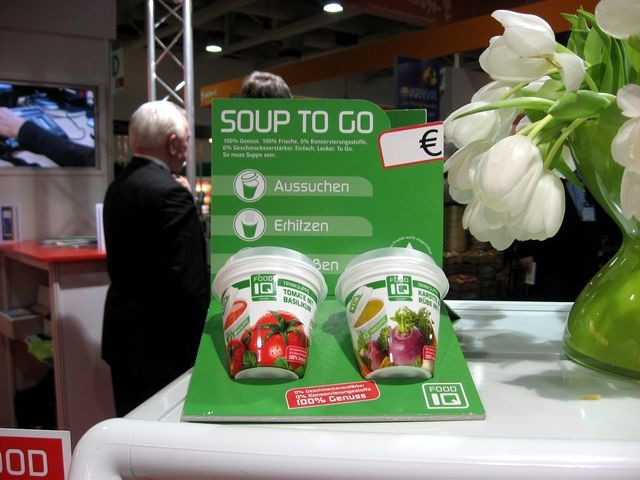 "Lo specialista del Convenience, Lekkerland, presenta al Freshconex la minestra da bere a marchio Food IQ. Le minestre sono in porzioni pronte confezionate in recipienti resistenti al calore. Esse vengono prodotte con la cosiddetta procedura "sottovuoto", che permette di mantenere inalterata la maggior parte delle vitamine e dei sapori naturali. E' sufficiente scaldare il recipiente chiuso per pochi minuti nel forno a microonde e la minestra e' pronta per essere consumata. Grazie ad un apposito coperchio con beccuccio, queste minestre sono ideali anche per i viaggi e il consumo fuori casa."