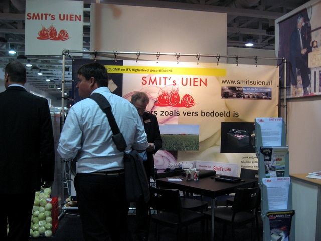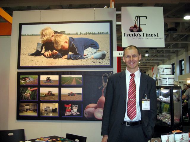 Stand Smit Swifterbant (Olanda). In foto Fredo Smit, in rappresentanza dell'azienda. L'azienda è specializzata in scalogno.