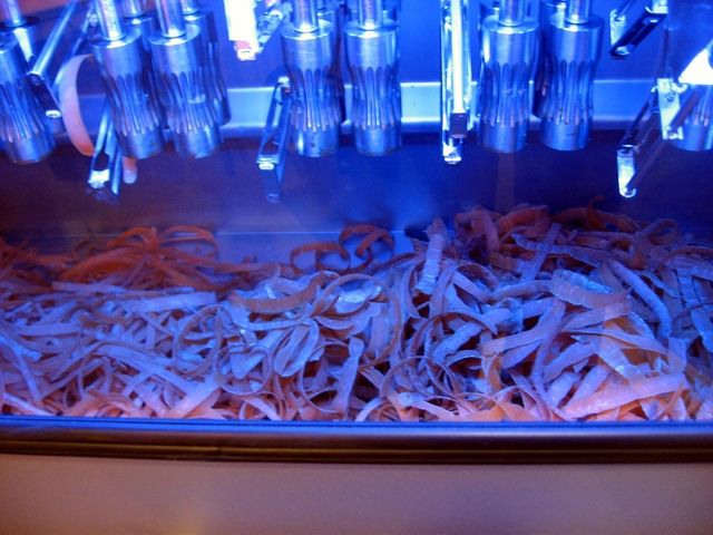 L'ortaggio passa attraverso dei pistoni accanto ai quali sono posizionate delle lame a diverse angolazioni, in modo da pelare tutto l'ortaggio.