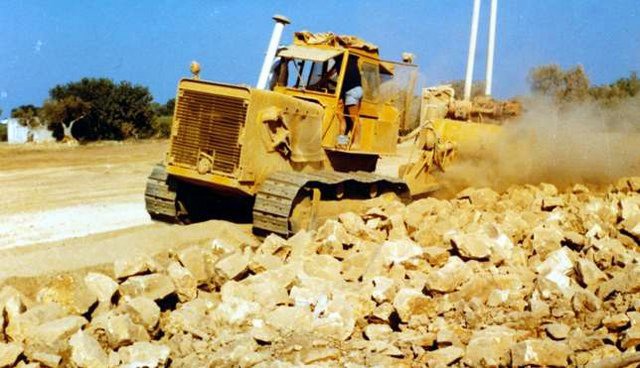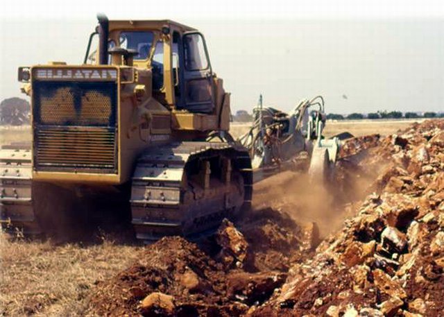 Dopo l'operazione di scasso del suolo roccioso, potenti macchine frantumano frammenti di roccia per la realizzazione del vigneto.