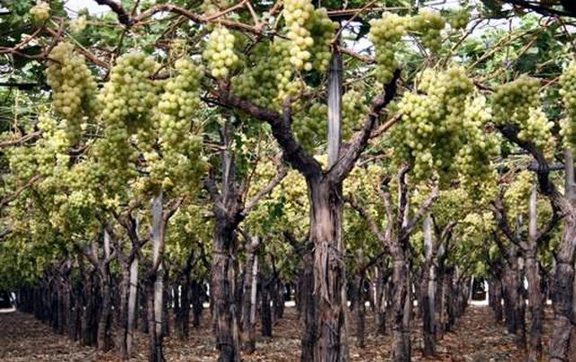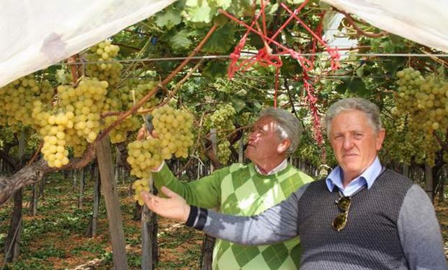 Vito e Leonardo Milillo in un vigneto a tendone di eccellente produzione della varieta' Italia (uva con almeno 16 gradi Brix e riscontri economici interessanti). La famiglia Milillo conduce circa 150 ettari: in prevalenza vigneti ad uva da tavola ma anche ciliegie e ortaggi. Soltanto recentemente l'azienda sta coltivando uva Crimson Seedless per la commercializzazione tardiva. La varieta' Italia, costituita dall'italiano Alberto Pirovano nel 1911, se ottenuta in condizioni pedo-climatiche favorevoli e con le opportune tecniche colturali, offre quantita' e qualita' elevata. Essa e' ancora l'uva piu' coltivata, con una produzione nazionale di circa 6 milioni di quintali e il 40% del totale produttivo. E’ disponibile sul mercato dalla meta' di agosto alla meta' di gennaio.
