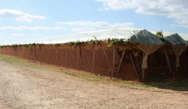 Alla meta' di ottobre 2011, il ricercatore Mario Colapietra ha visitato i vigneti dell'azienda Milillo di Rutigliano (BA). La famiglia Leonardo, Vito e Mario Milillo di Rutigliano, pionieri della produzione di uva da tavola Italia di gran pregio in Puglia, hanno cominciato a coltivare anche la Crimson senza semi. In foto, Leonardo Milillo in un vigneto della varieta' Crimson Seedless allevato a tendone e protetto con teli di plastica per ritardare la raccolta e proteggere l'uva dalla pioggia. La produzione ottenuta nell'azienda Milillo e' notevole per quantita' di uva prodotta per ettaro (oltre 30 tonnellate), uniformita' e sviluppo straordinario dei grappoli e delle bacche. Dopo aver eseguito la prima raccolta, si attendono alcuni giorni per far completare la maturazione e colorazione dei grappoli rimasti sulla pianta. La produzione e' certificata GlobalGAP.