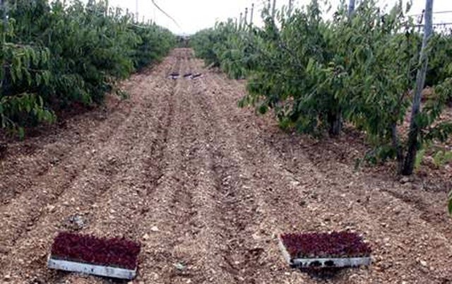 "Trapianto dell'insalata riccia Lollo Rossa (Lactuca sativa var. Lollo rossa Spectrum) in un ciliegieto. In Puglia, la raccolta delle ciliegie termina alla fine di giugno. L'idea dei fratelli Milillo di utilizzare l'impianto anche per altre colture, e' particolarmente consigliata per i ciliegieti. Essi, infatti, soffrono, a causa della diffusione di impianti privi di copertura, del rischio di "spacco del frutto" dovuto alle piogge primaverili, all'inizio della maturazione. In questi casi, attuando una rotazione produttiva con le colture orticole e' possibile rifarsi del mancato raccolto o integrare il reddito. L'insalata riccia Lollo Rossa e' molto apprezzata per il gusto delizioso delle sue foglie. Predilige condizioni di esposizione al sole, con clima temperato e notevole resistenza al freddo. Si trapianta alla profondita' di pochi centimetri e alla distanza di 25-30 cm sulla fila e 25-30 cm tra le file."