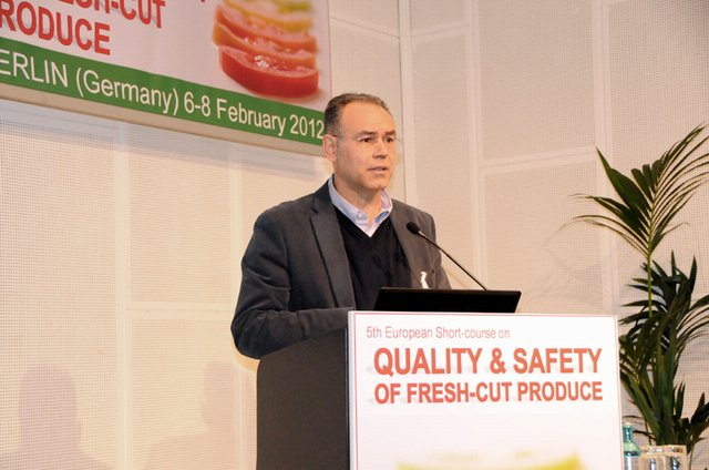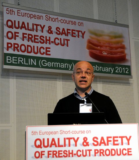 "Il Prof. Giancarlo Colelli (Universita' di Foggia) ha aperto il corso con una introduzione sulla qualita' dei prodotti di IV gamma e sui fattori che possono comprometterla. Dopo aver definito cosa si intende per prodotti fresh-cut (gia' puliti, tagliati, imbustati e pronti per l'uso), ha spiegato che tali prodotti si deteriorano piu' rapidamente dei corrispondenti prodotti interi, per via delle "ferite" associate alla lavorazione. Il Prof. Colelli ha fatto luce sugli attributi interni ed esterni che influenzano la qualità dell'ortofrutta di IV gamma come: apparenza, consistenza, gusto/aroma, valore nutritivo e sanità. E' stata dunque sottolineata la necessita' di miglioramenti in termini di sicurezza alimentare e qualita' dei prodotti fresh-cut e l'importanza di controllare e ottimizzare tutti i passaggi della filiera produttiva, a cominciare dalle pratiche pre-raccolta, fino alla gestione post-raccolta, alla lavorazione e alla distribuzione."