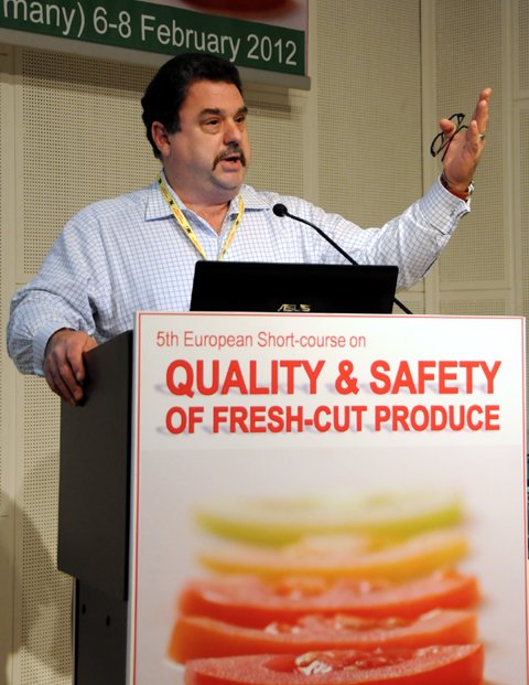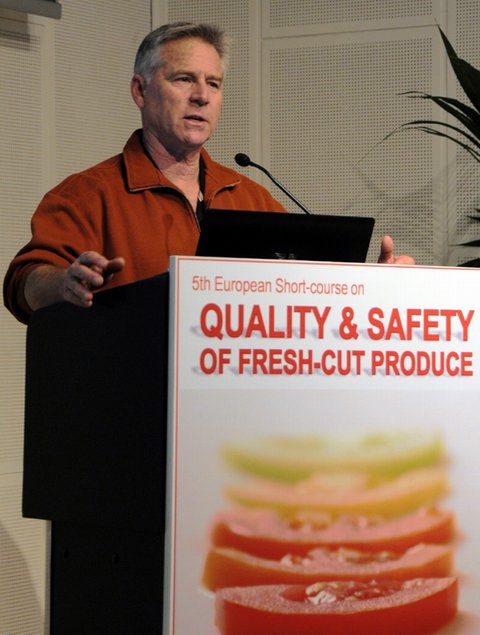 Il Prof. Trevor Suslow (University of California Davis, USA), ha illustrato in dettaglio gli aspetti relativi alla biologia e ai sistemi di controllo sul deperimento dei prodotti freschi e sulla presenza di eventuali microorganismi patogeni. Il servizio di sanita' pubblica degli Stati Uniti ha individuato un certo numero di microorganismi associati a casi gravi di intossicazione alimentare. Quelli relativi ai prodotti ortofrutticoli includono: Cyclospora cayetanensis, Escherichia coli O157:H7, Virus dell'Epatite A, Listeria monocytogenes, Norovirus, Salmonella spp. e Shigella spp., che possono originare da diverse fonti come materia prima contaminata, processo di produzione/contaminazione ambientale (acqua, aria, superfici, imballaggi, manodopera, insetti, animali). Il Prof. Suslow, in un secondo intervento, ha illustrato le metodologie di analisi attualmente impiegate per il rilevamento quali-quantitativo di patogeni nei prodotti fresh-cut. In particolare, il docente ha posto l'accent