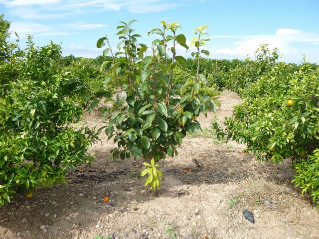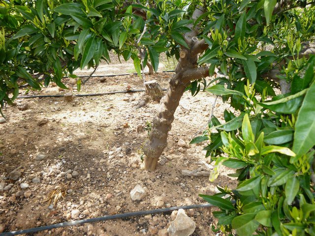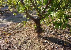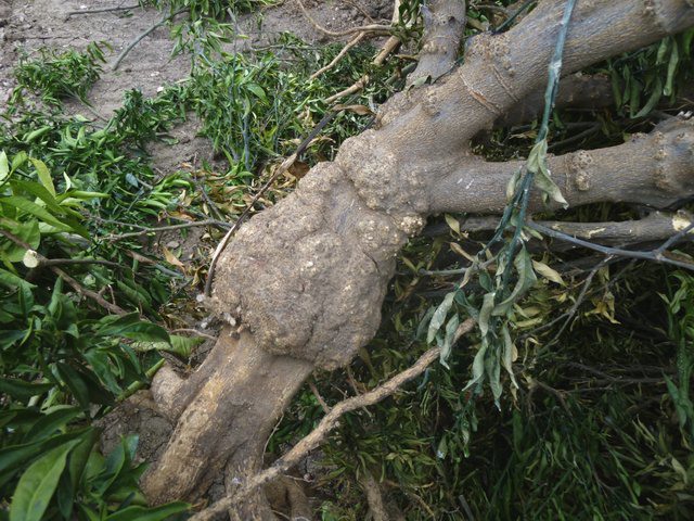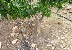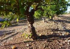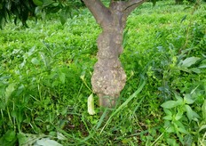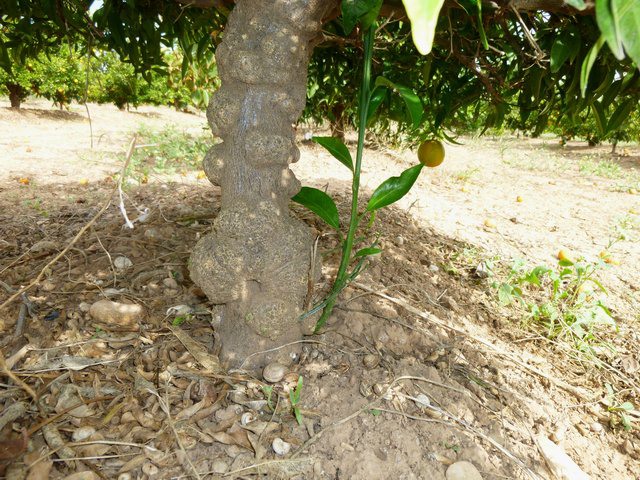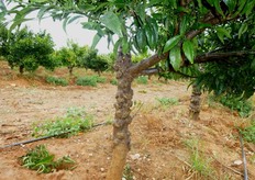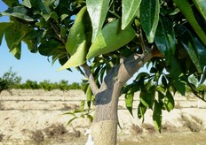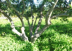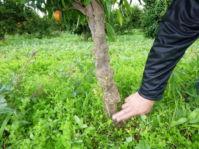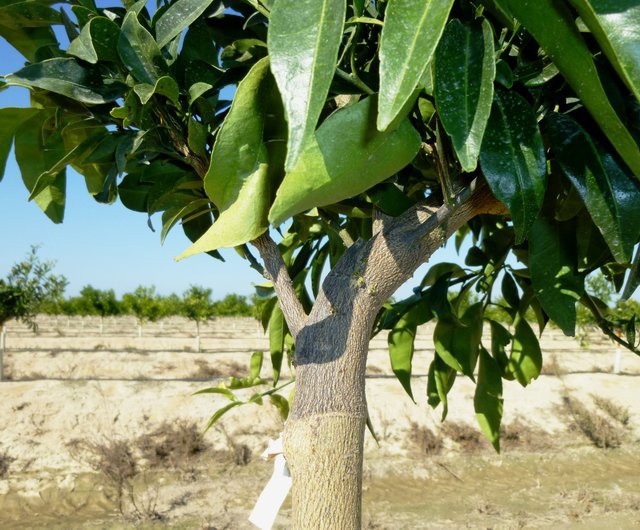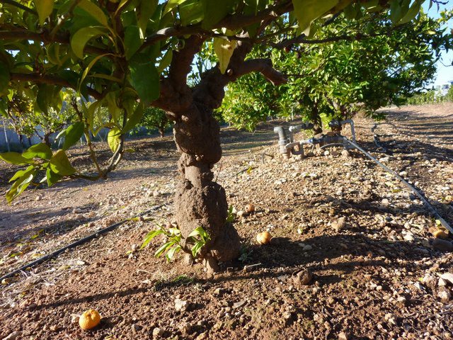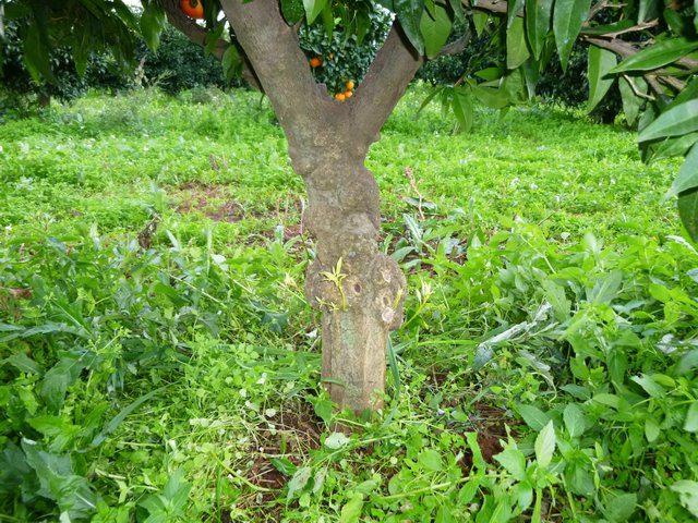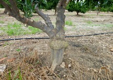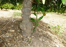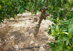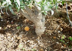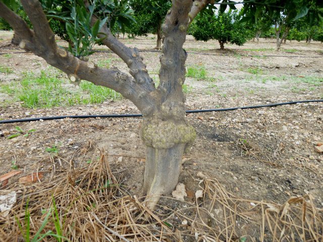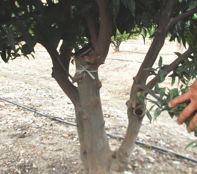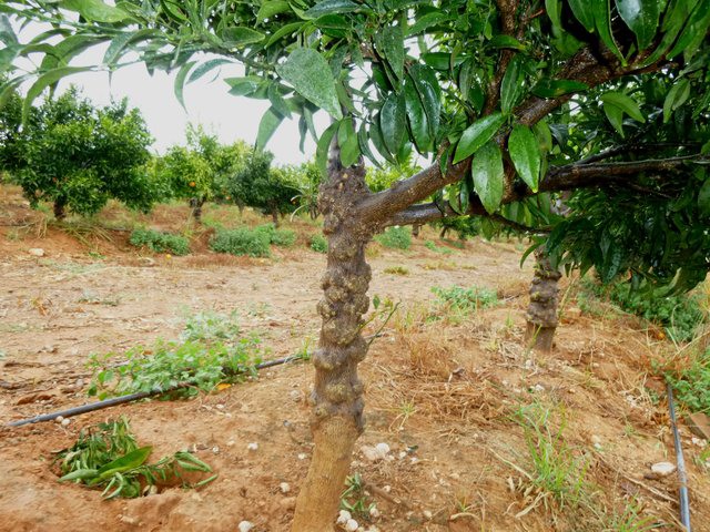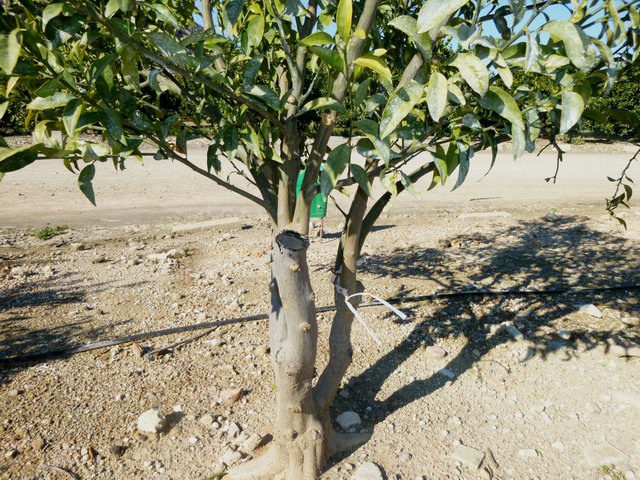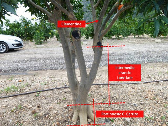 "In foto si noti l'assenza dei noduli sulle branche di piante di clementine "Clemenrubi" al settimo anno, reinnestate su vecchie piante di arancio "Valencia", innestate a loro volta su portainnesto C. Carrizo."