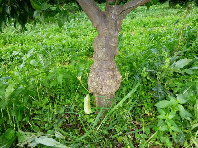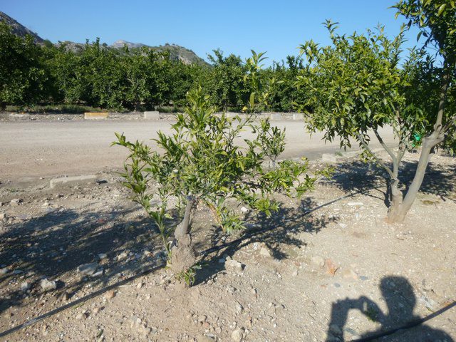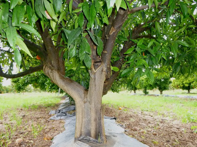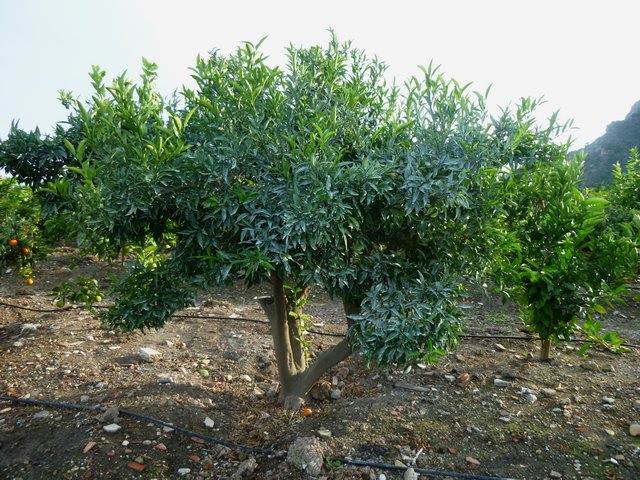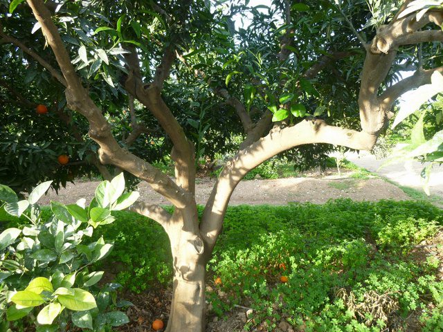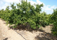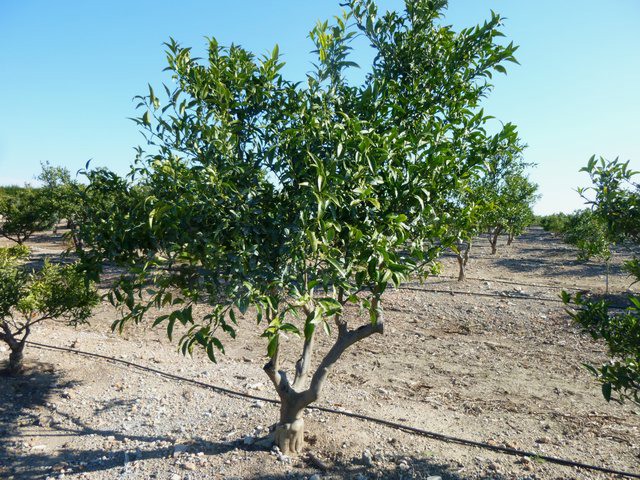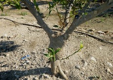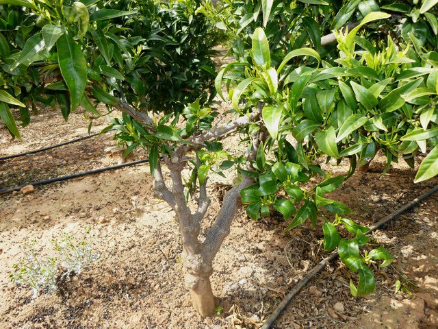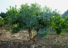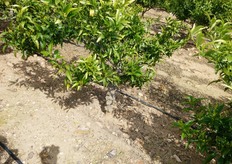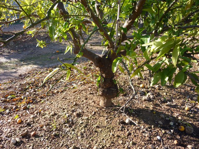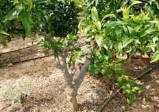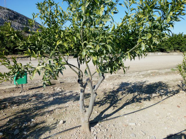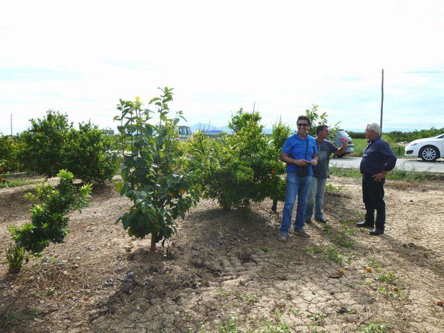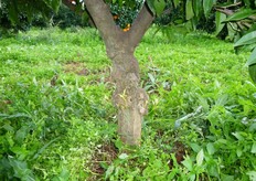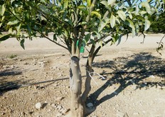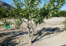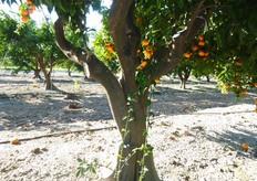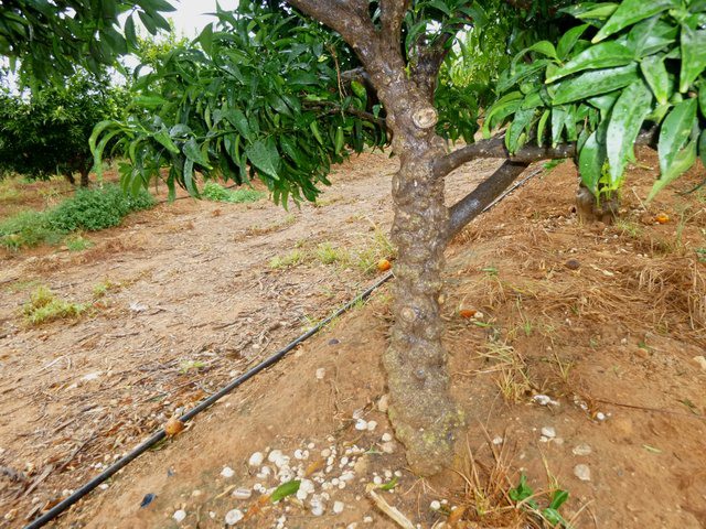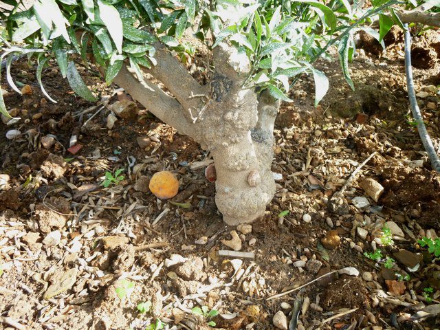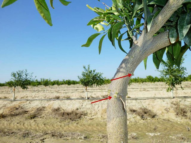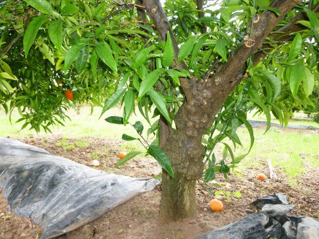 "In foto si noti l'assenza dei noduli sulle branche di piante di clementine "Clemenrubi" al settimo anno, reinnestate su vecchie piante di arancio "Valencia", innestate a loro volta su portainnesto C. Carrizo."