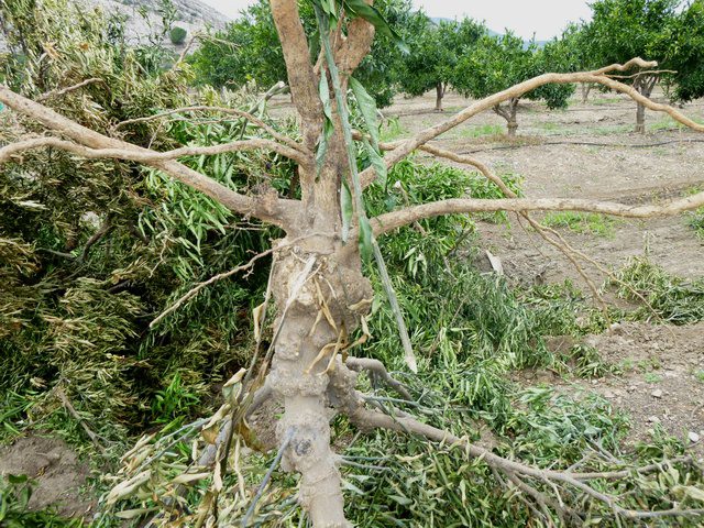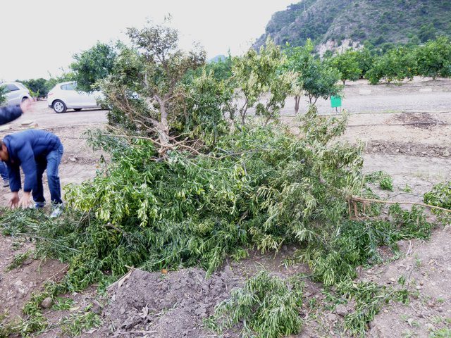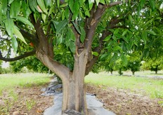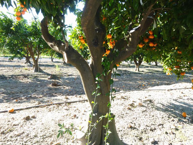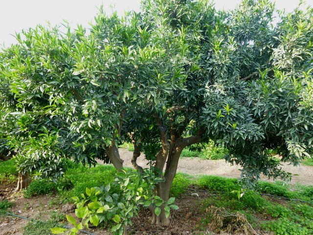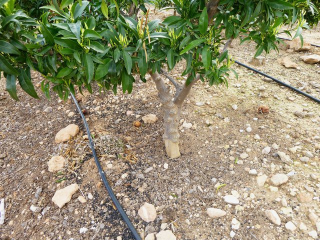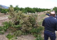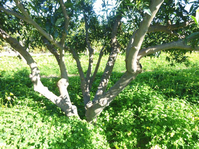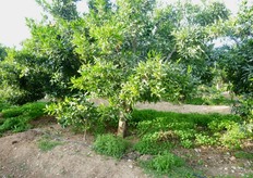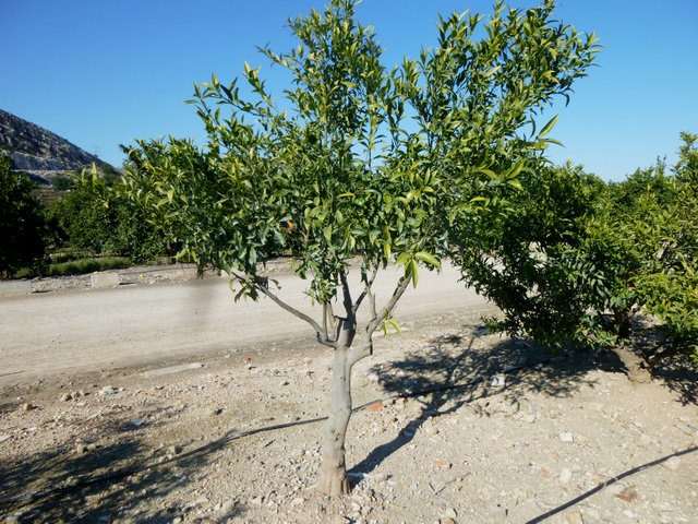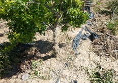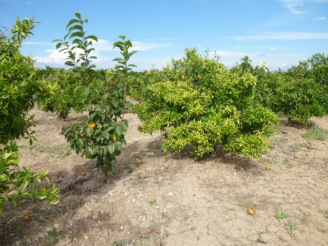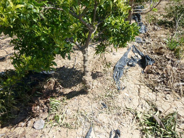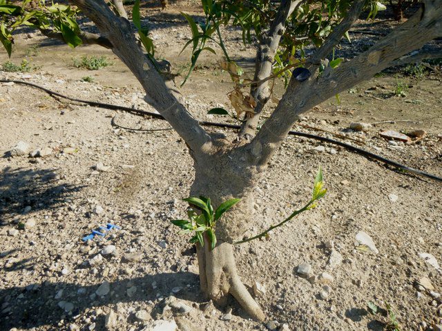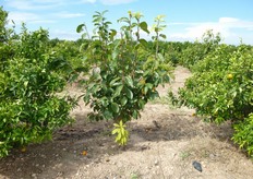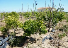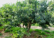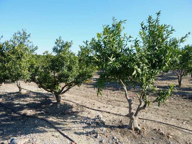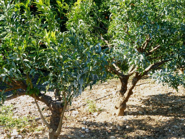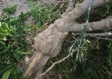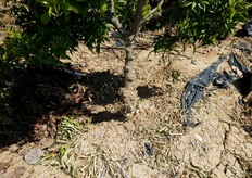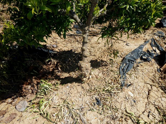 "In foto si noti l'assenza dei noduli sulle branche di piante di clementine "Clemenrubi" al settimo anno, reinnestate su vecchie piante di arancio "Valencia", innestate a loro volta su portainnesto C. Carrizo."