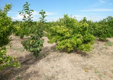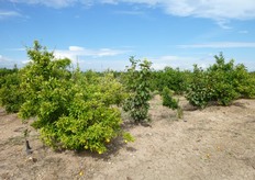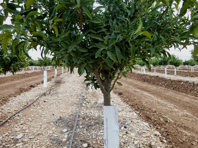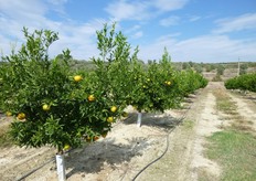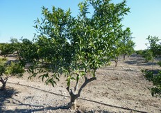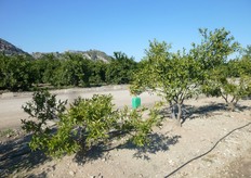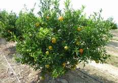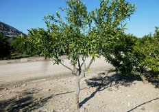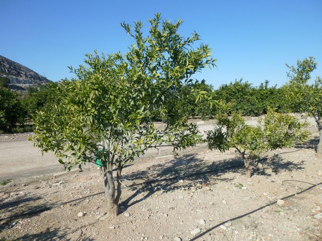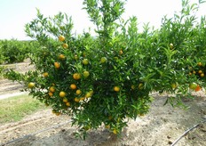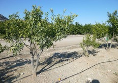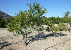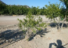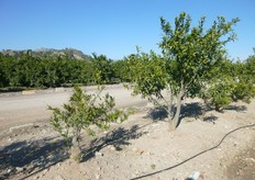 "In foto, a sinistra, pianta di clementine "Clemenrubi" innestata direttamente su portinnesto "C. Carrizo", a destra la stessa varieta' innestata sull'intermedio (portinnesto "C. Carrizo", intermedio arancio "Valencia" e Clementine "Clemenrubi")."