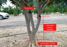 "Sequenza portinnesto "C. Carrizo", intermedio arancio "Valencia" (ma potrebbe essere utilizzato anche Salustiana", "Lane Late", "Washington Navel" "Navelina") e Clementine "Clemenrubi")."