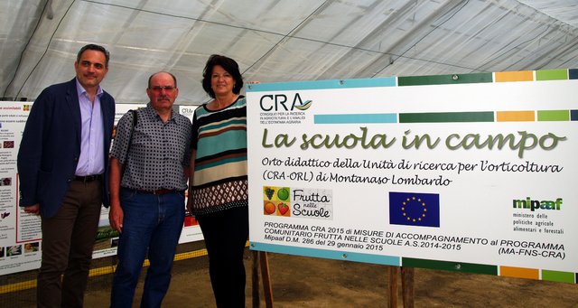 "In foto da sinistra: Alessandro Silvestrelli direttore Rijk Zwaan Italia, Giuseppe Leonardo Rotino, direttore CRA-ORL ed Elisabetta dirigente di ricerca CRA e coordinatore nazionale del progetto "Frutta nelle scuole"."