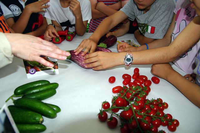 Letizia Bonfiglioli di Rijk Zwaan mentre mostra i diversi ortaggi ai bambini.