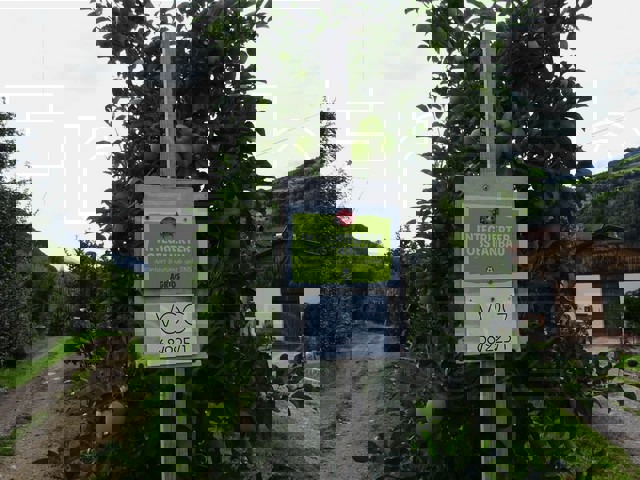 Il cartellino numerico e' per la rintracciabilita': 68 e' il numero della coop Melix Brixen di Bressanone, socia del VOG cui fa capo il maso; 225 rappresenta il numero del Moarhof; l'1 e' il numero dell'appezzamento, riportato anche nel quaderno di campagna.