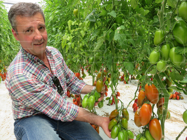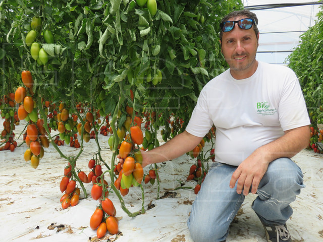 Piero Aringoli (agente vendite Lazio) mostra alcuni grappoli di pomodoro allungato Torrano.