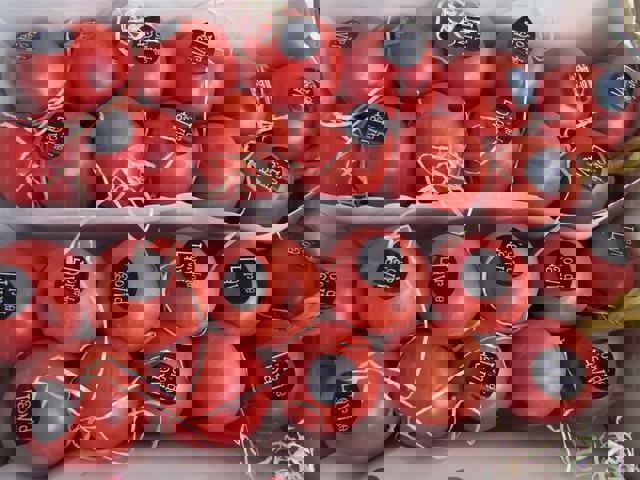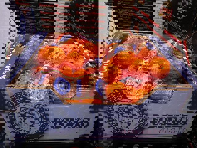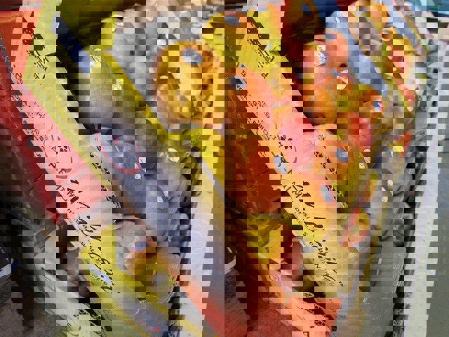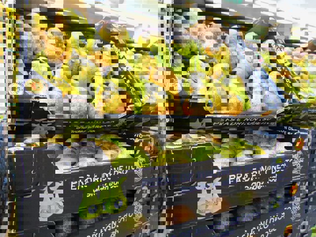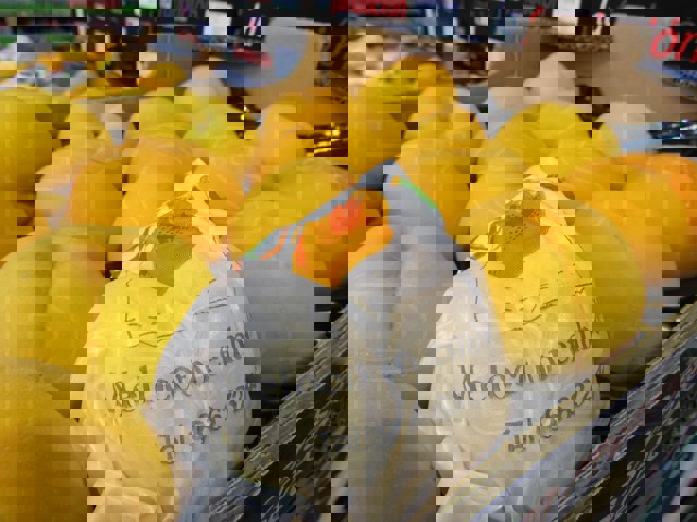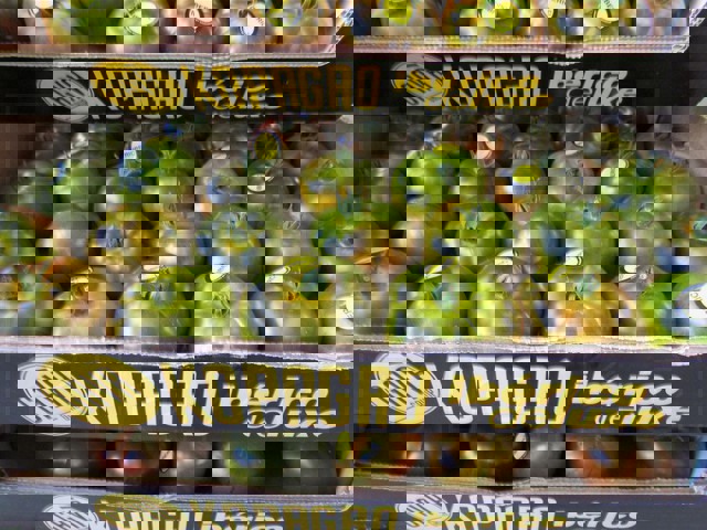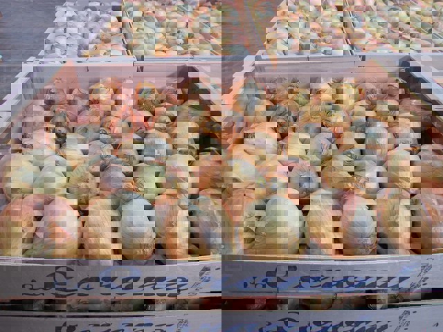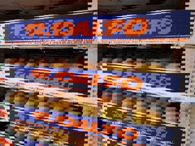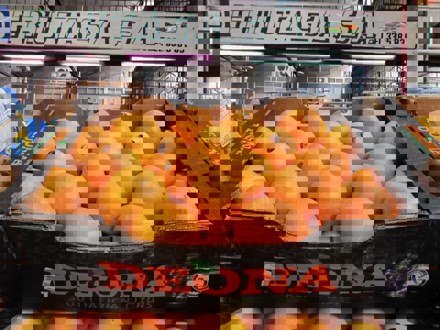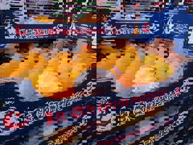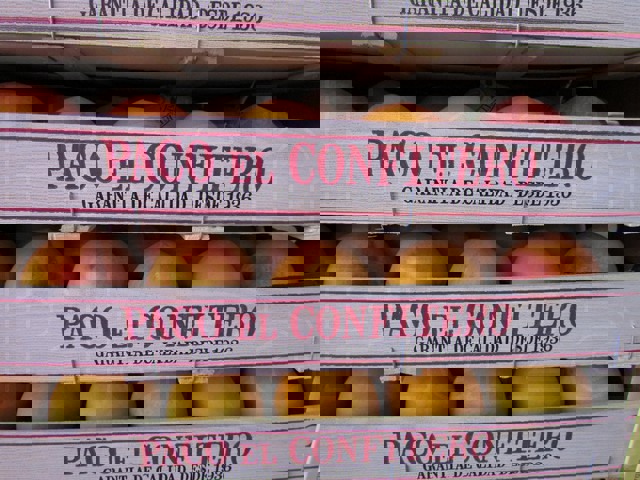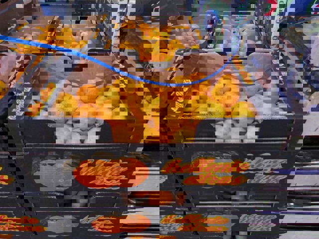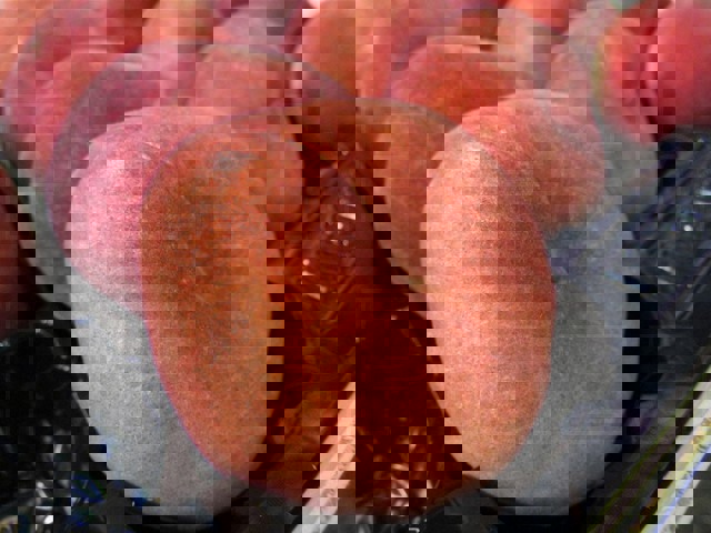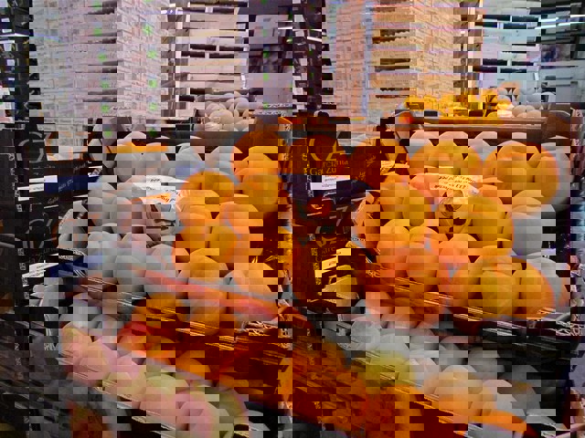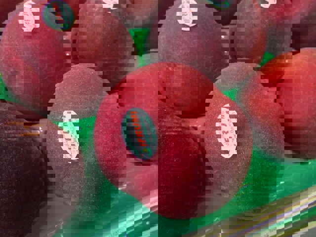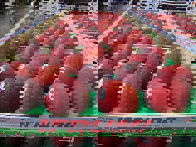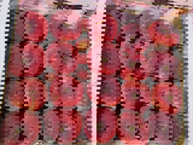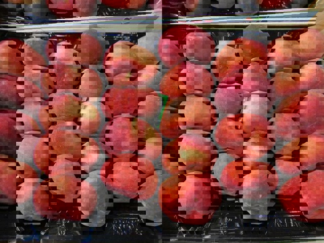 Massiccia l'offerta di pesche piatte o tabacchiere. In foto: paraguayo Plati Belle, calibro AA.