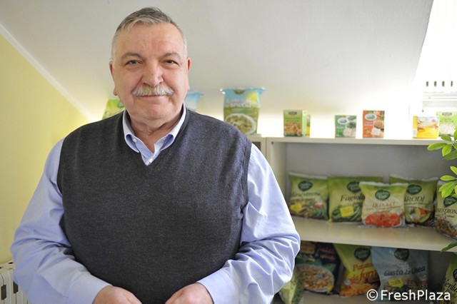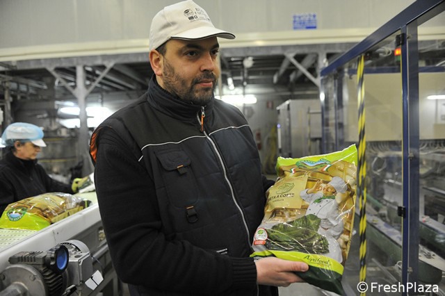 Gianluca del Corvo direttore di stabilimento mostra una busta di spinaci surgelati.