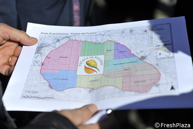 Il Consorzio per la tutela e valorizzazione della Patata del Fucino Igp ha organizzato, il 5 aprile 2018, una giornata di visite nel territorio di produzione del tubero. E un convegno sulle opportunità di questo prodotto. FreshPlaza ne ha approfittato per visitare un paio di aziende del territorio. Nel dettaglio, una mappa della zona del Fucino, con il logo stilizzato della Patata Igp. (Reportage di Cristiano Riciputi)