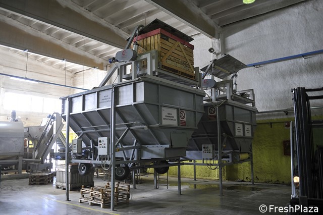 La tramoggia per il carico delle patate in linea di lavorazione.