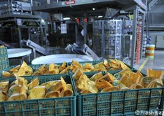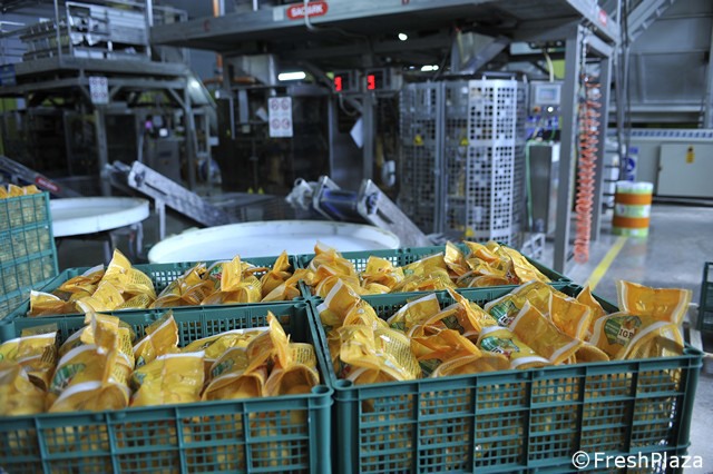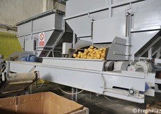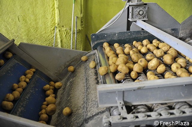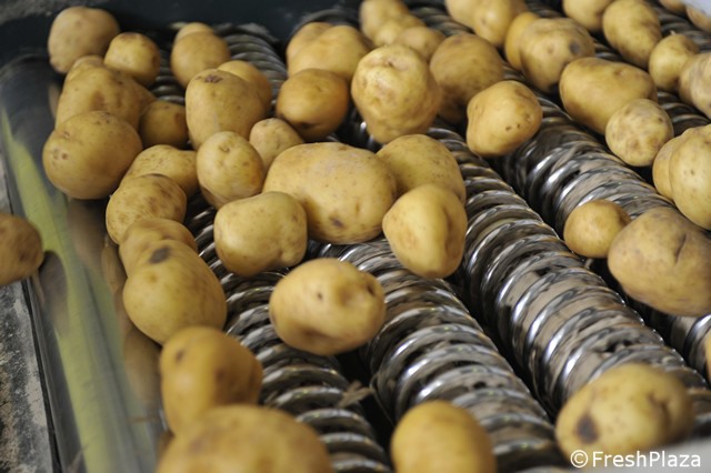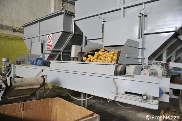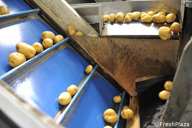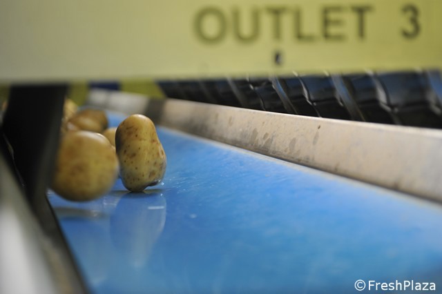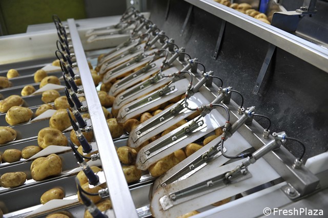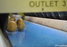 Le patate vengono disposte in file per la selezione ottica.