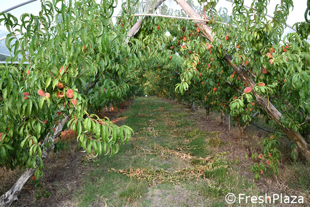 Piante allevate a Y incrociata. A terra, i residui della potatura effettuata periodicamente per favorire l'insolazione dei frutti eliminando alcuni rami.