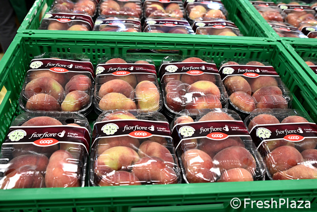 Saturnia è una pesca che ha saputo conquistare importanti spazi di mercato, con rapporti di collaborazione in esclusiva con alcune delle principali catene della GDO italiana. In foto: Saturnia in vaschette da 500 grammi a marchio Sapori&Dintorni Conad.