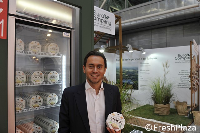 Roberto Felicetti, amministratore unico di BioSolidale. Due le novita' offerte ai visitatori: la crema di fave e le fave in olio extra vergine di oliva.