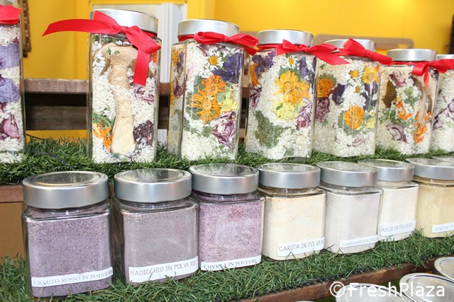 Frutta, verdura, erbe aromatiche e fiori disidratati vengono mixati per creare risotti, sia in confezioni di vetro che in Pet da utilizzare quotidianamente...oppure macinati con un macchinario apposito, creando delle farine/polveri impalpabili, da utilizzare come insaporitori naturali o coloranti a casa.
