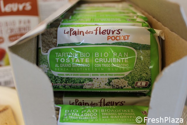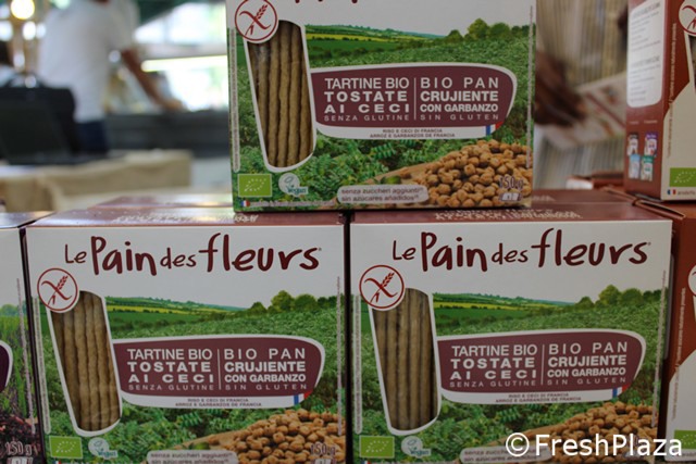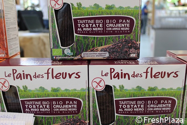 L'azienda francese Ekibio ha portato in fiera le novita' disponibili sul mercato italiano. In foto le tartine bio tostate al riso nero, senza glutine, a marchio Le Pain des fleurs.