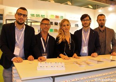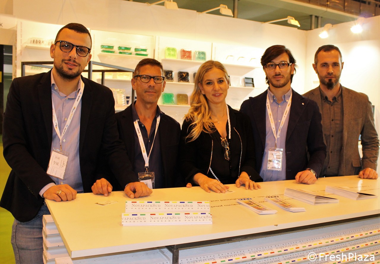 Stand Novapack Sud. Da sinistra a destra: Rosario Sallemi (responsabile commerciale estero), Marco Schilirò (ufficio progettazione e design), Lisa Pisani (Ceo), Rosario Pisani (responsabile ufficio marketing) e Alessandro Criscione (responsabile vendite Spagna).
