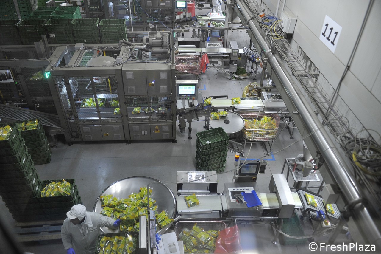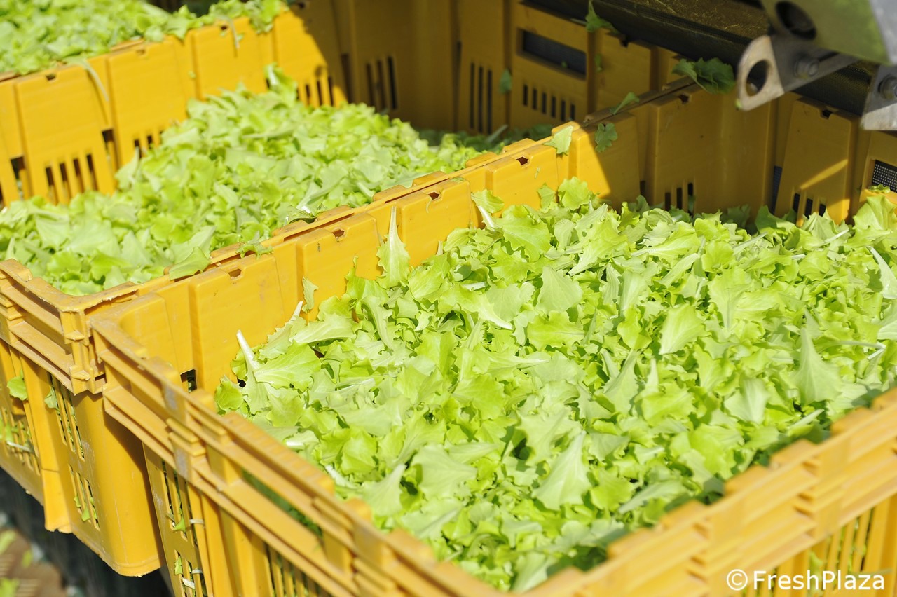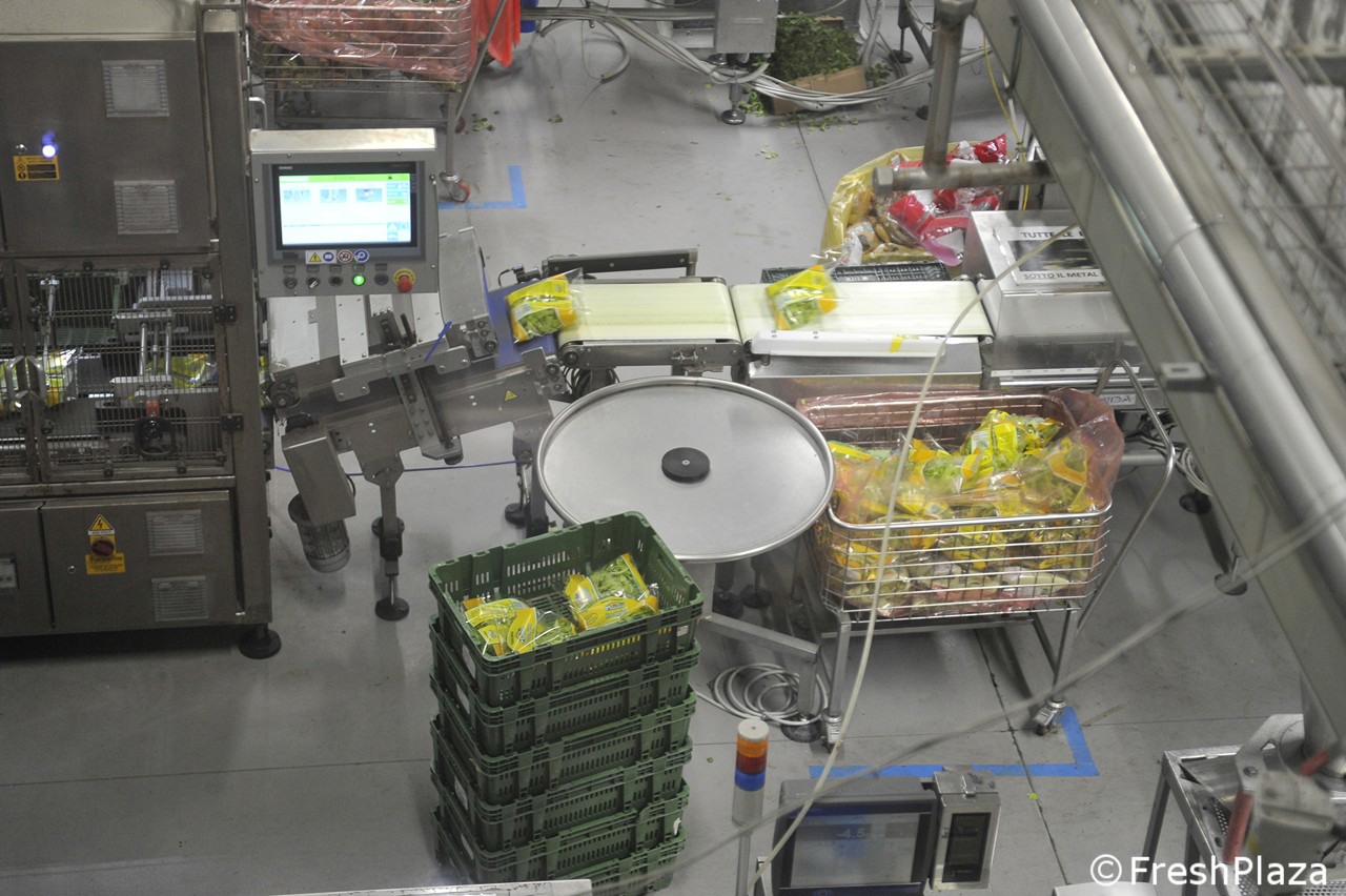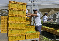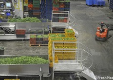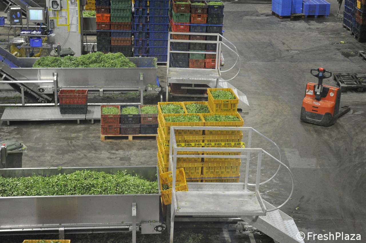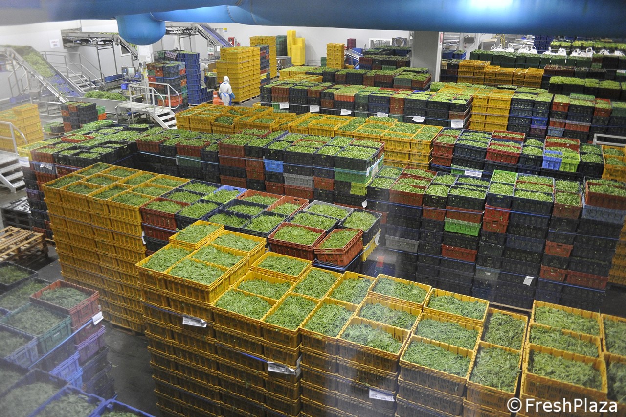 Le casse di verdura pronta per la quarta gamma vengono impilate sulle pedane